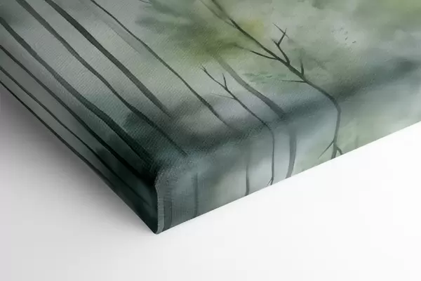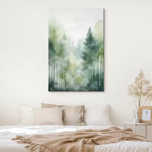 Vászonkép Akvarellfestmény, amely egy ködös erdőt ábrázol magas fenyőfákkal és hegyekkel a háttérben. Nr s46690