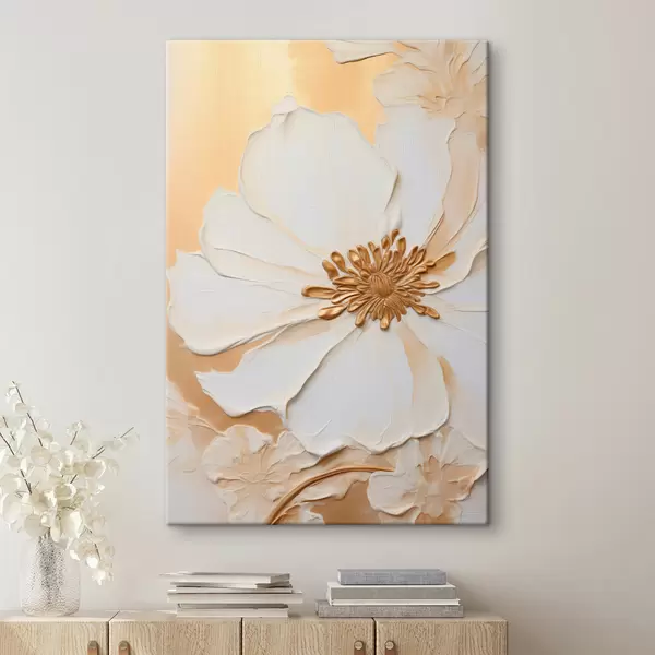 Vászonkép Fehér virág finom szirmokkal, vastag ecsetvonásokkal imitálva, világos narancssárga texturált háttérrel Nr s46691