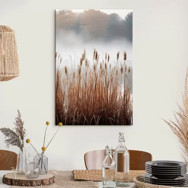 Vászonkép Magas nádasok nőnek egy víztestben, a víz tükrözi a nádasokat, ködös háttér, lágy fény, természeti táj Nr s46696