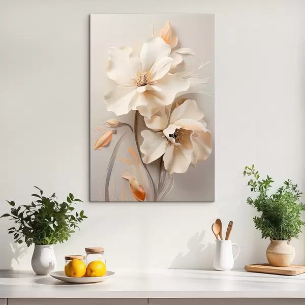 Vászonkép Fehér virágok, lágy árnyékú szirmok, világos bézs háttér, elegáns kompozíció, minimalista stílus Nr s46700
