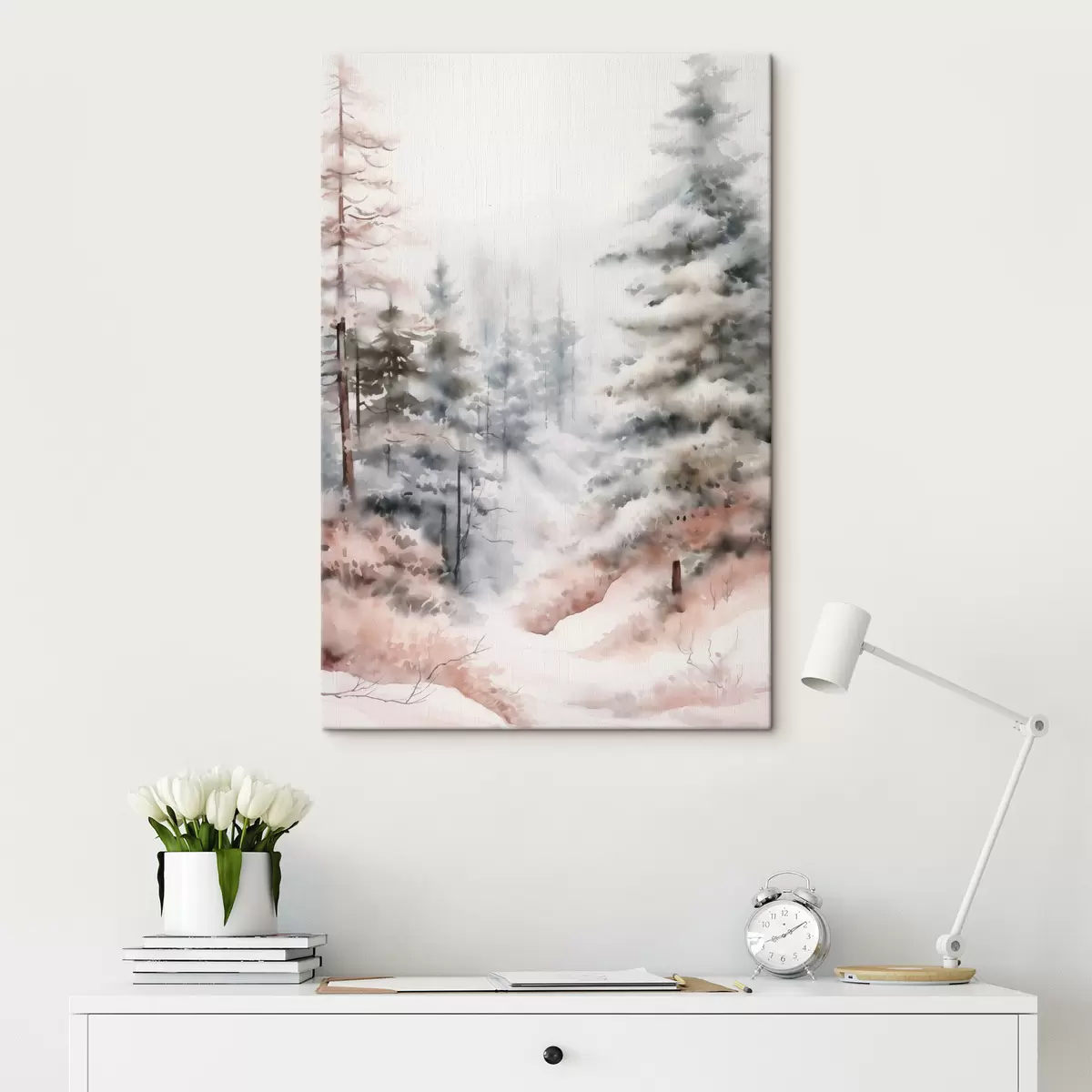 Vászonkép Hóval borított magas fenyőfák, ködös erdőben állva, lágy, tompa téli táj Nr s46702