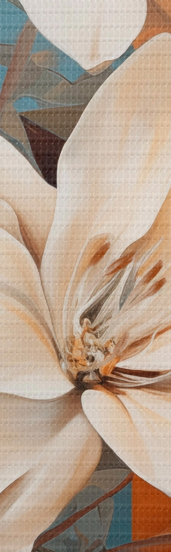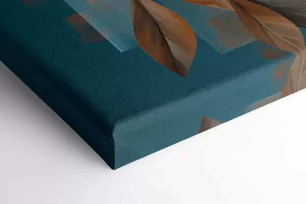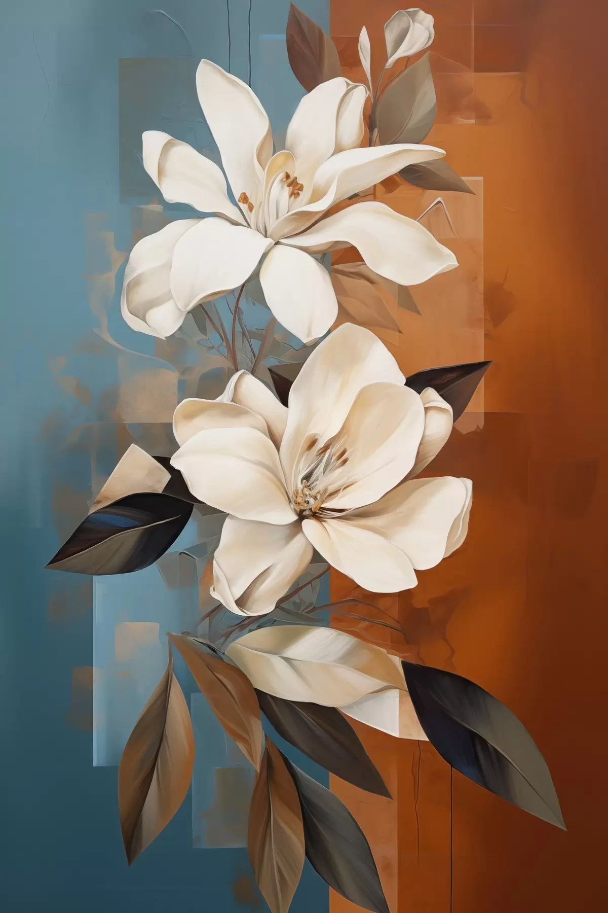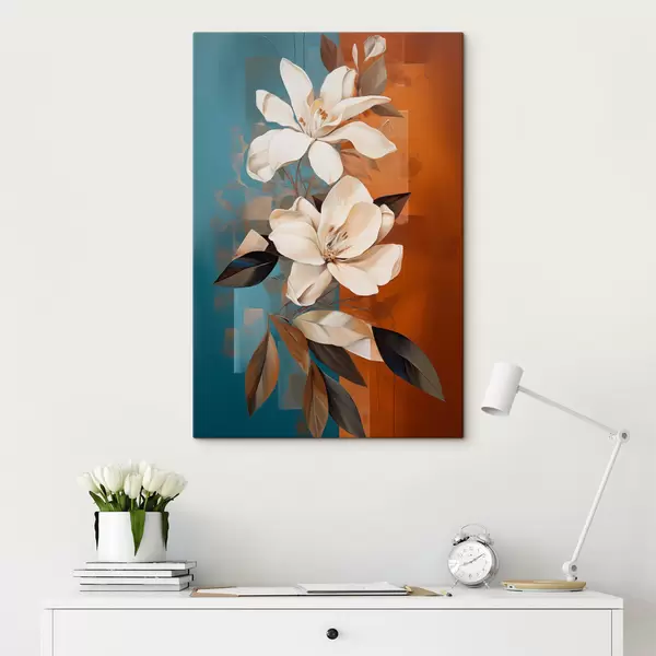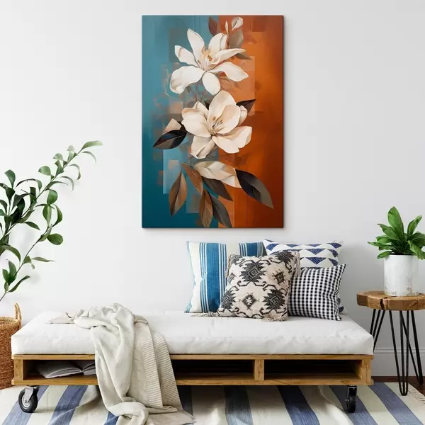 Vászonkép Absztrakt fehér virágok és levelek barna és kék háttérrel, absztrakt formákkal, minimalista stílusban. Nr s46710