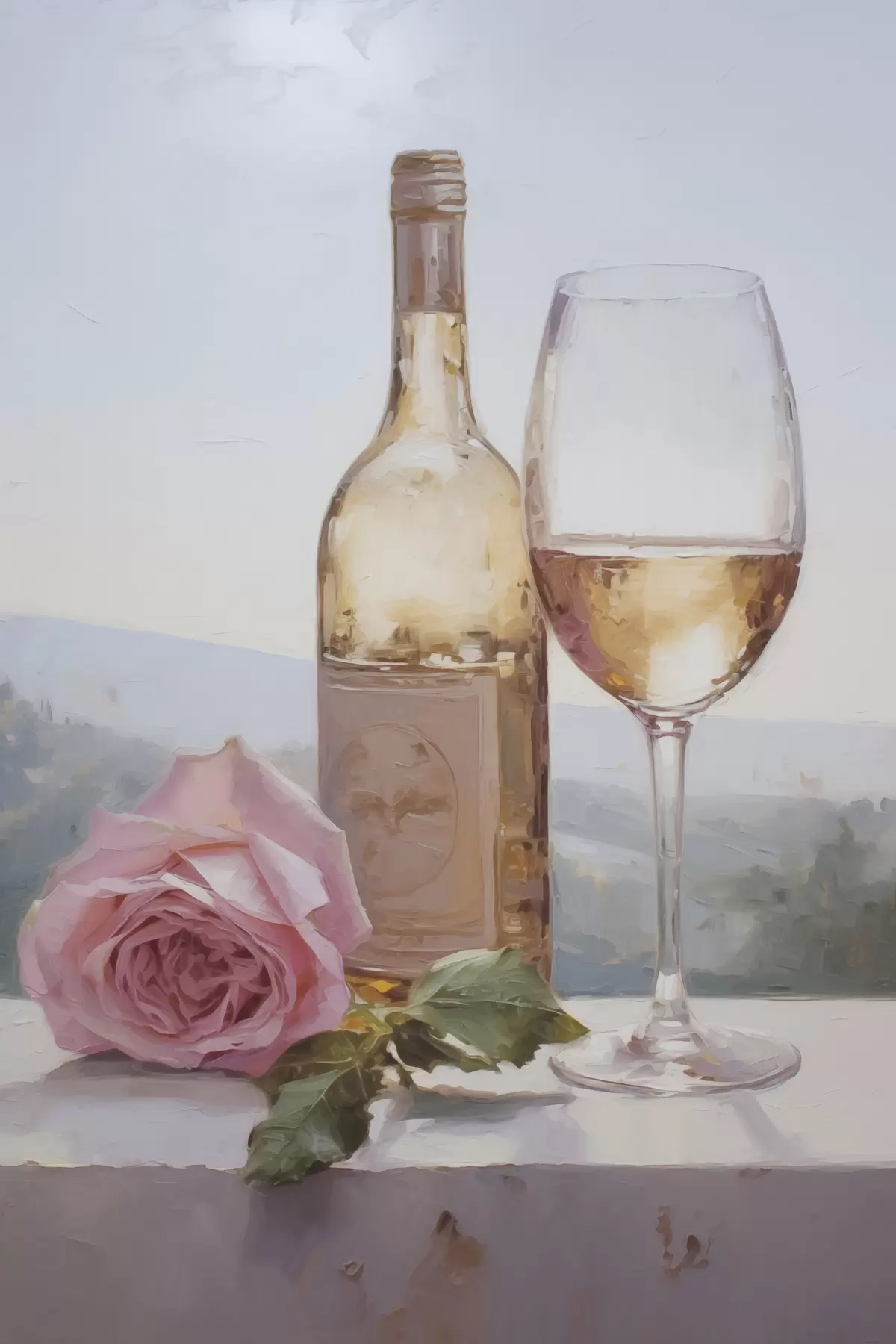 Vászonkép Egy üveg és egy pohár bor, valamint egy szemüveges kiskutya, festmény utánzat Nr s46721