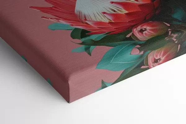 Vászonkép Protea csokor piros szirmokkal és zöld levelekkel rózsaszín háttérrel Nr s46946