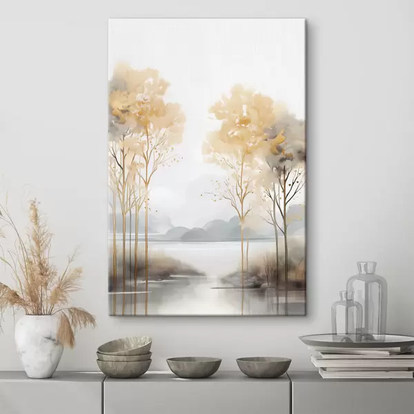 Vászonkép Dekoratív absztrakt táj, magas fák sárga levelekkel, folyó és köd a háttérben Nr s47015