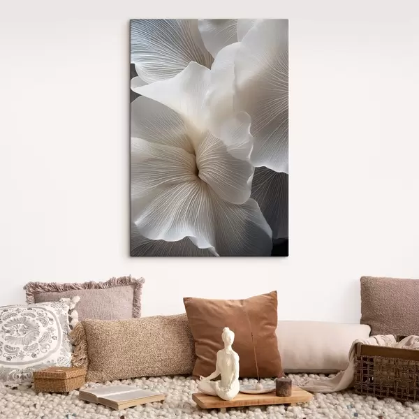 Vászonkép Közelkép finom, absztrakt fehér virágszirmokról, bonyolult vonalakkal és elmosódott sötét háttérrel Nr s47019