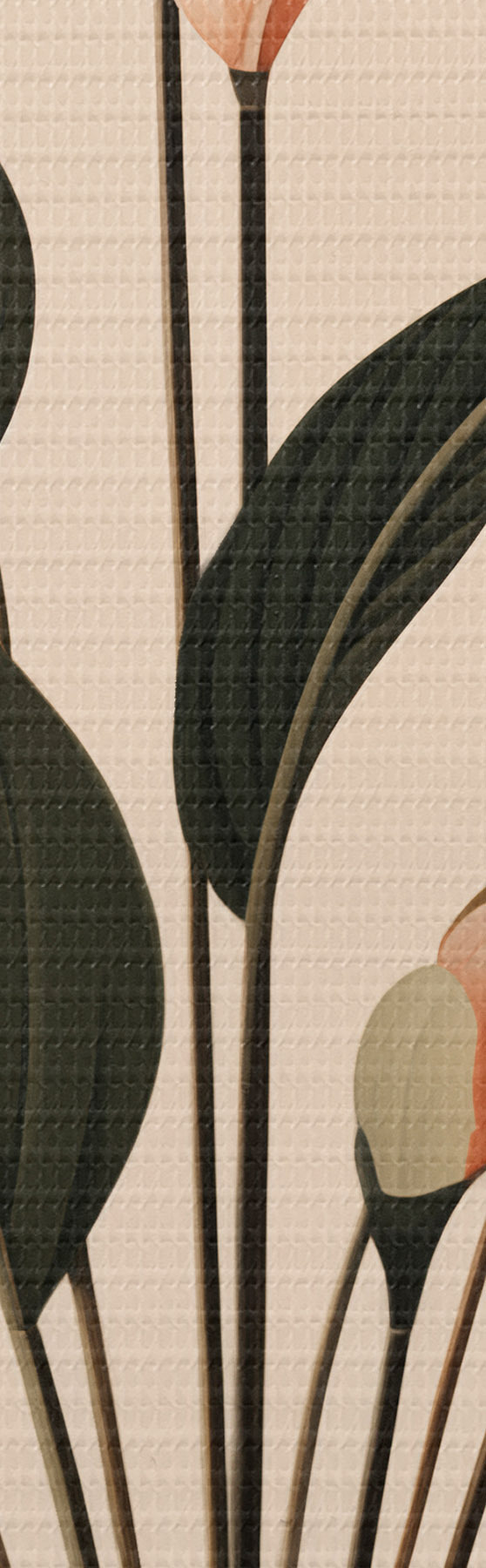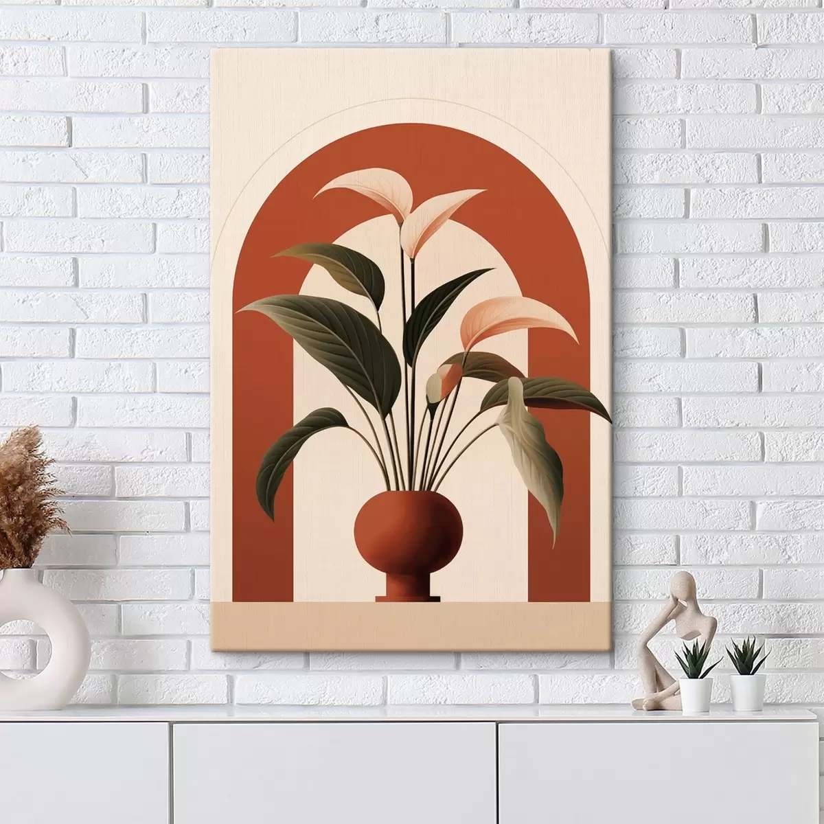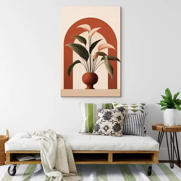 Vászonkép Absztrakt cserepes növény nagy zöld és bézs levelekkel egy krém színű boltív előtt, terrakotta díszítéssel Nr s47032