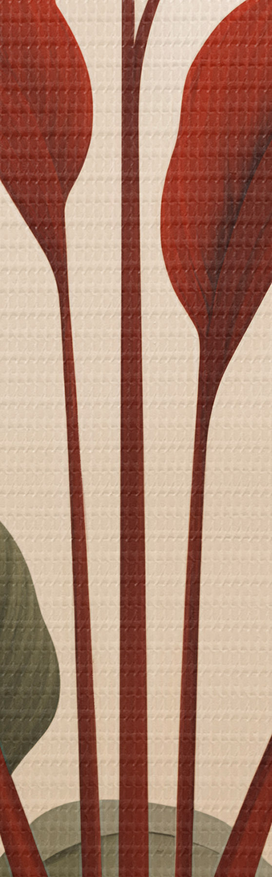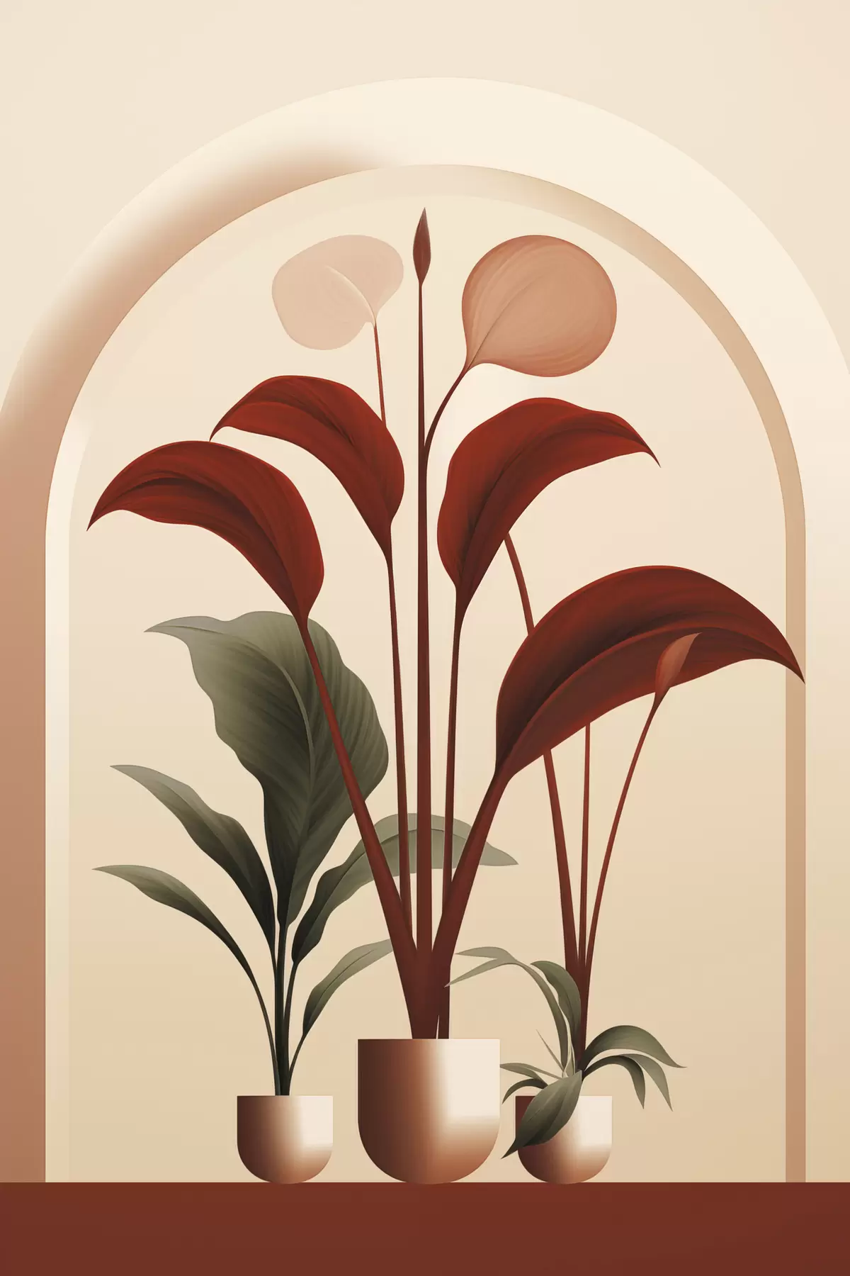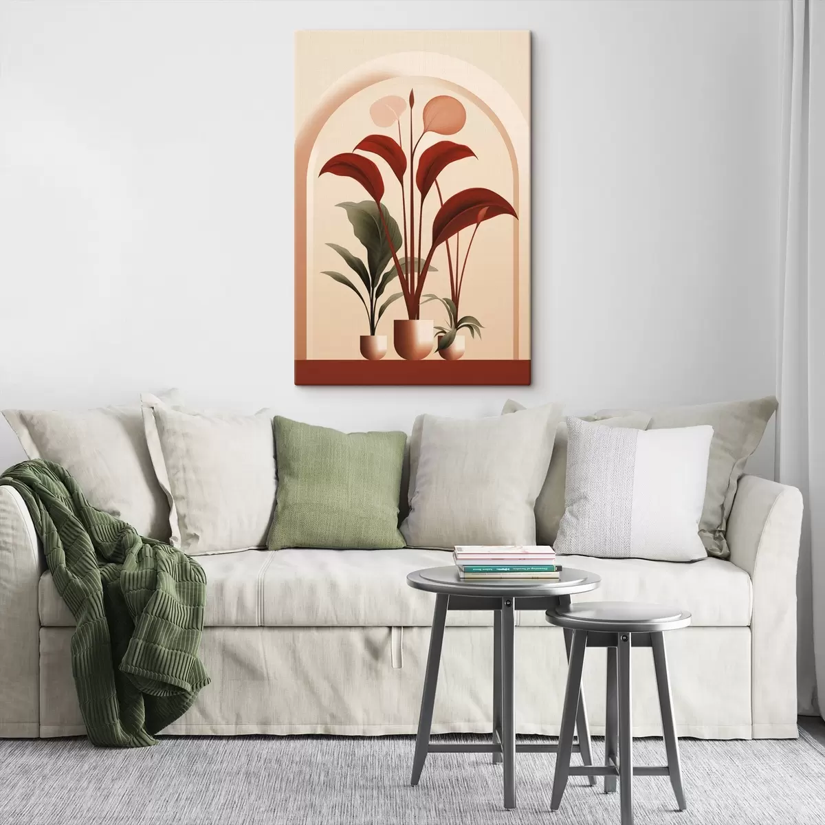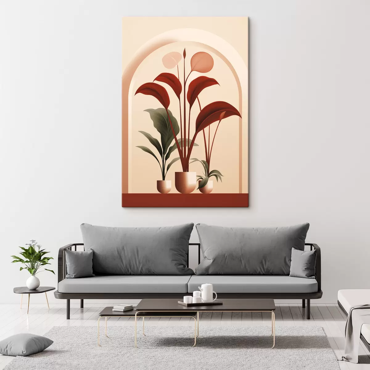 Vászonkép Absztrakt cserepes növények nagy zöld és piros levelekkel egy krém színű boltív előtt Nr s47033