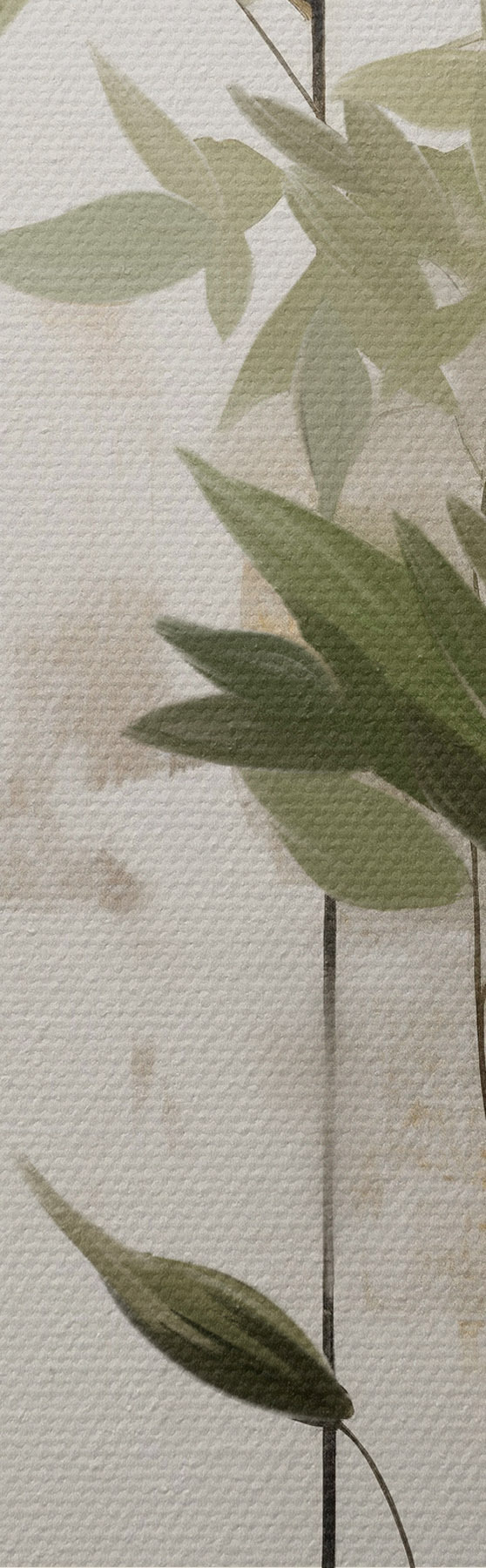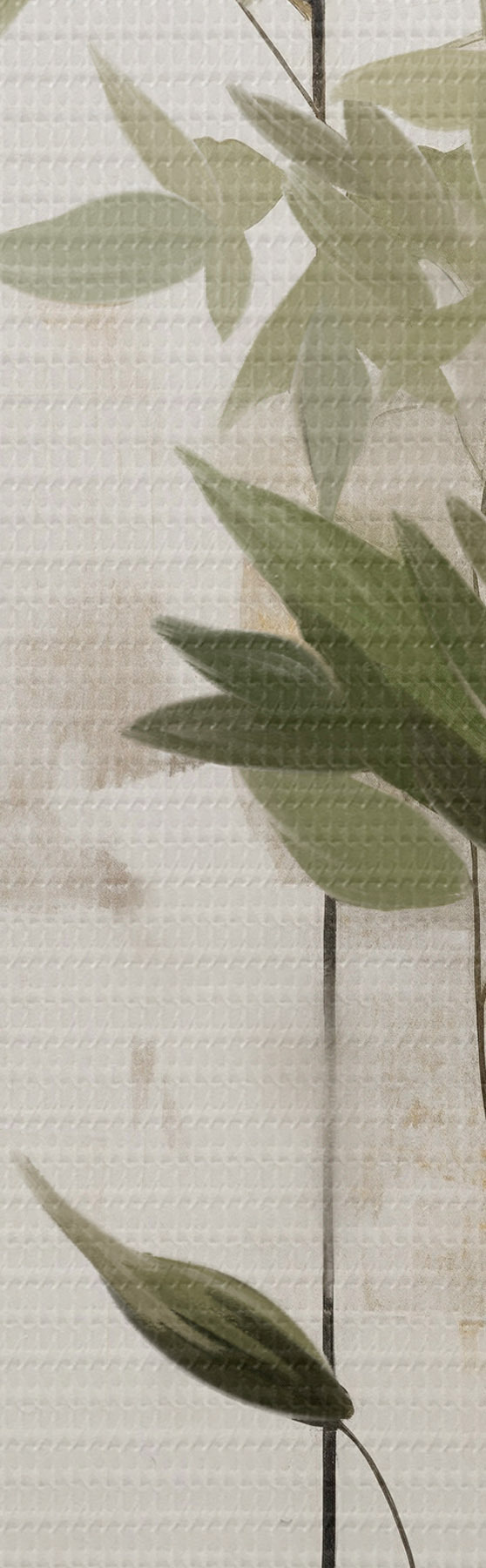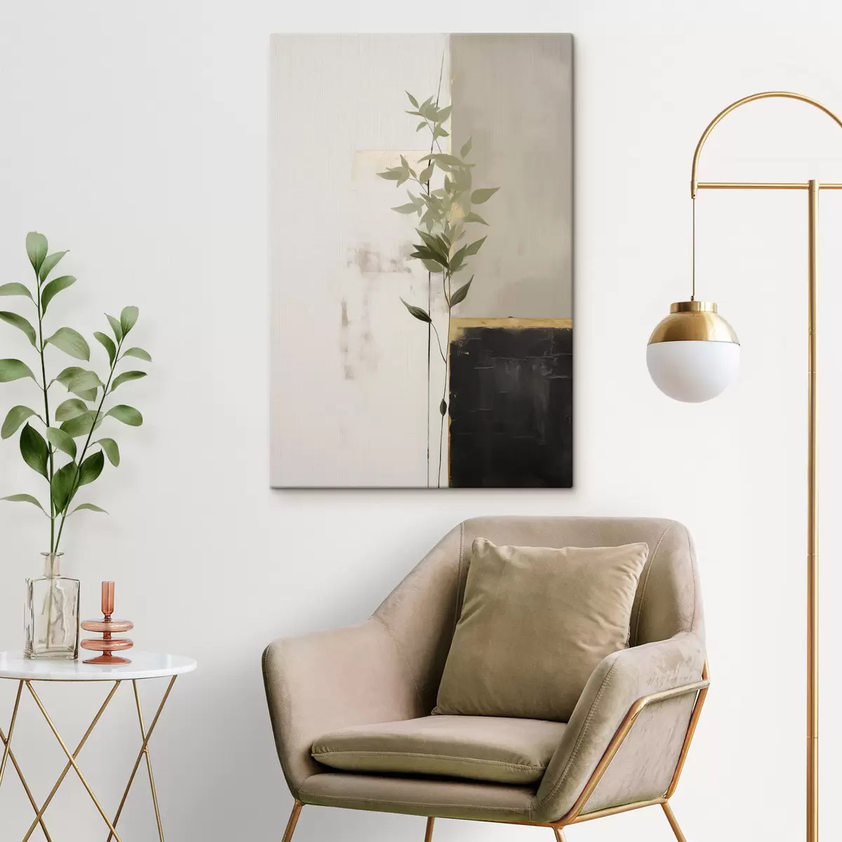 Vászonkép Minimalista textúrájú festmény, amelyen egy vázát és zöld leveleket ábrázolnak absztrakt geometriai alakzatok háttérében. Nr s47037