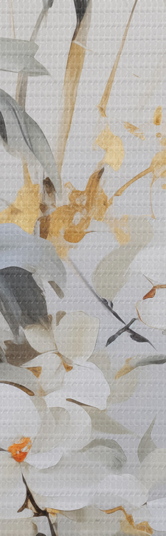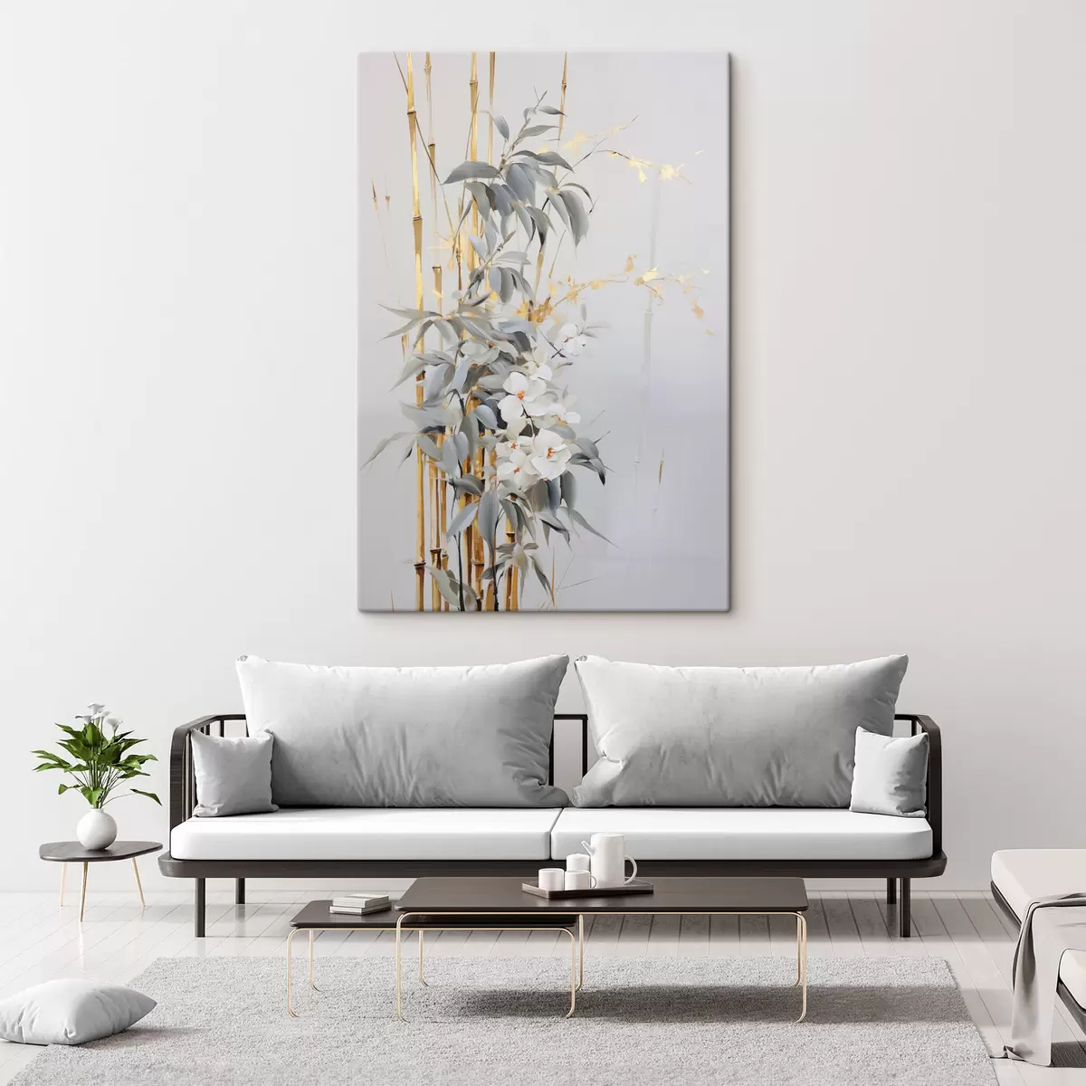 Vászonkép Absztrakt bambuszszárak sárga akcentussal, finom fehér virágokkal és halványzöld levelekkel, szürke háttérrel Nr s47038
