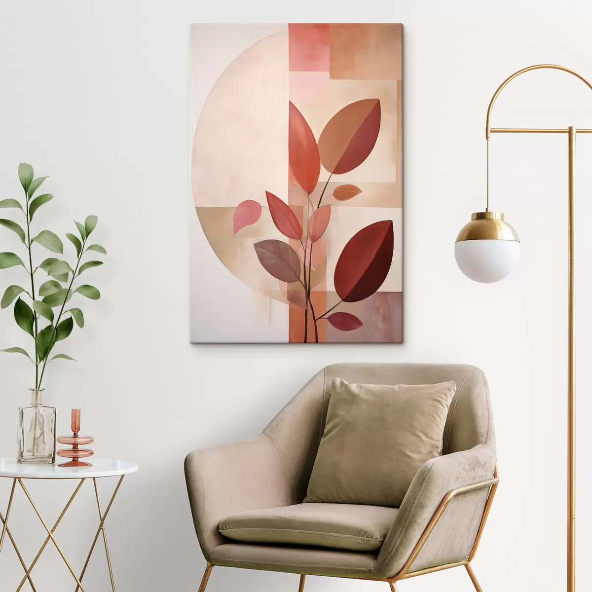 Vászonkép Absztrakt növény vörös levelekkel, geometrikus formák és lágy, tompított színekkel a háttérben Nr s47041