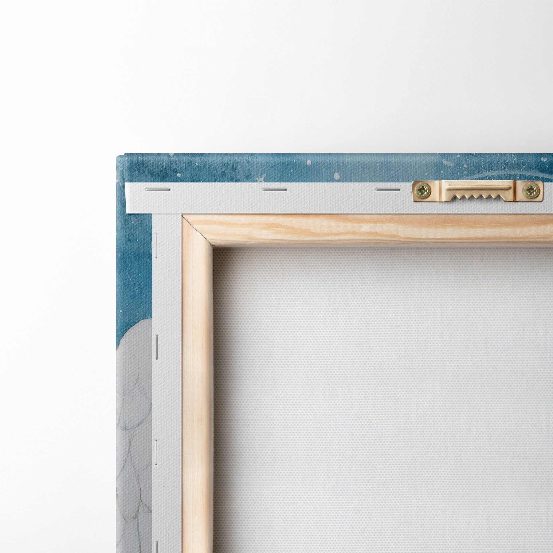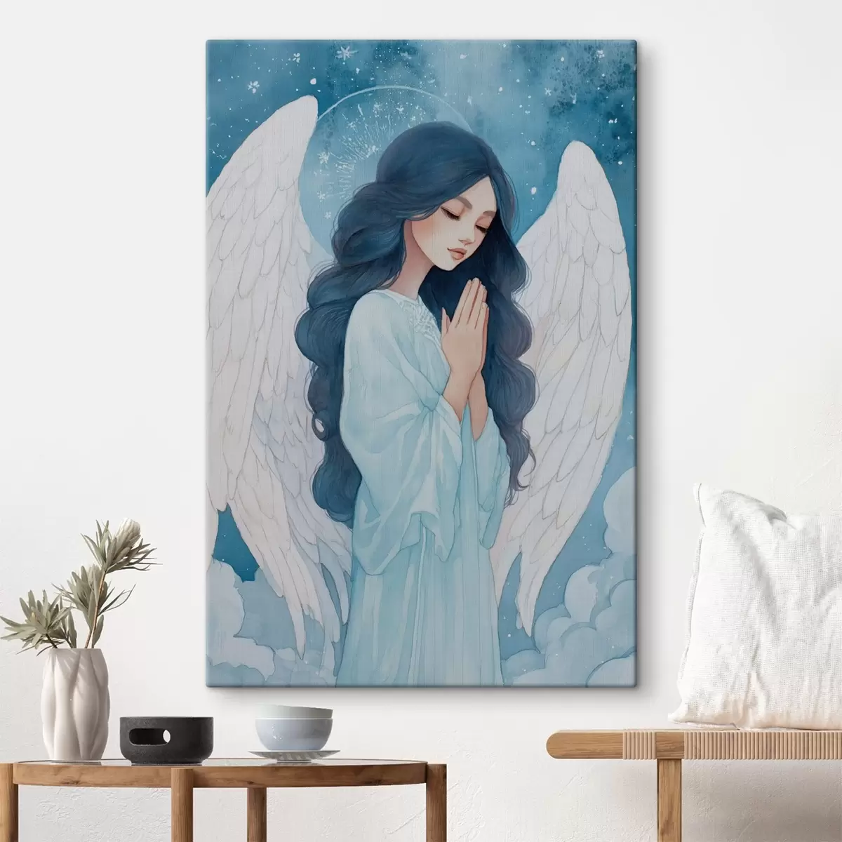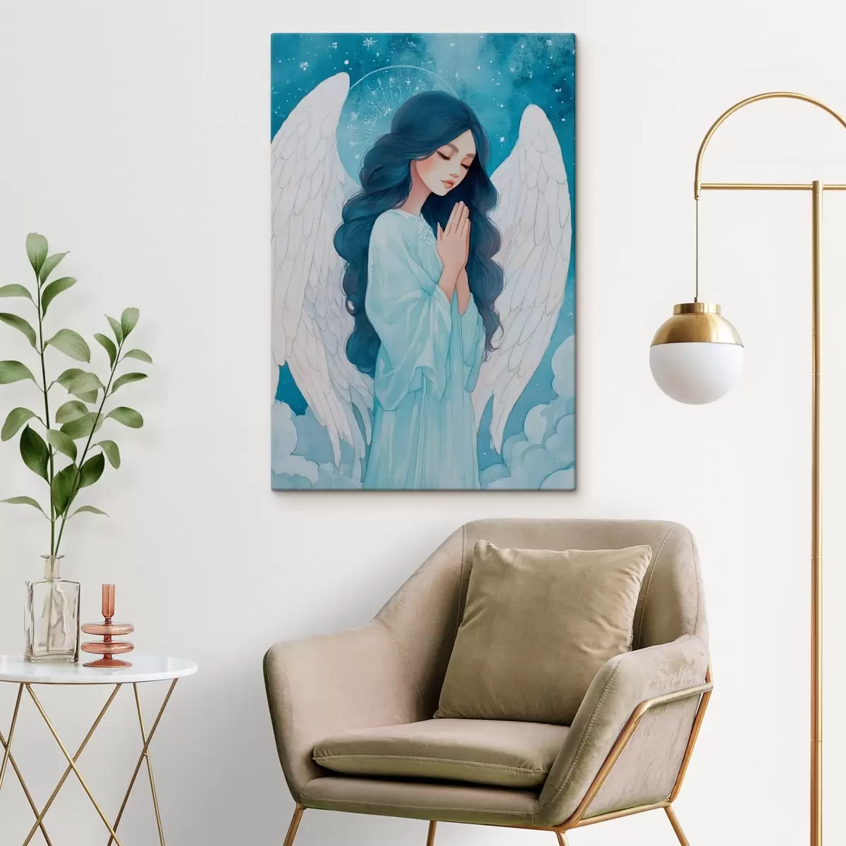 Vászonkép Bájos illusztráció egy angyalról a felhők között, fehér és kék színpalettával Nr s47095