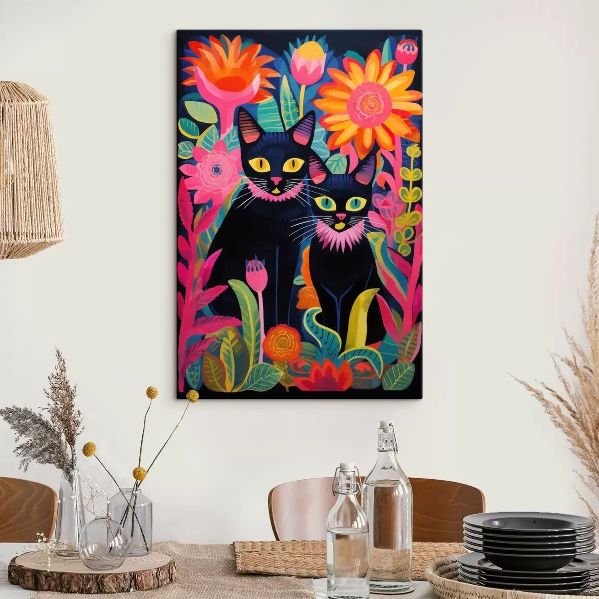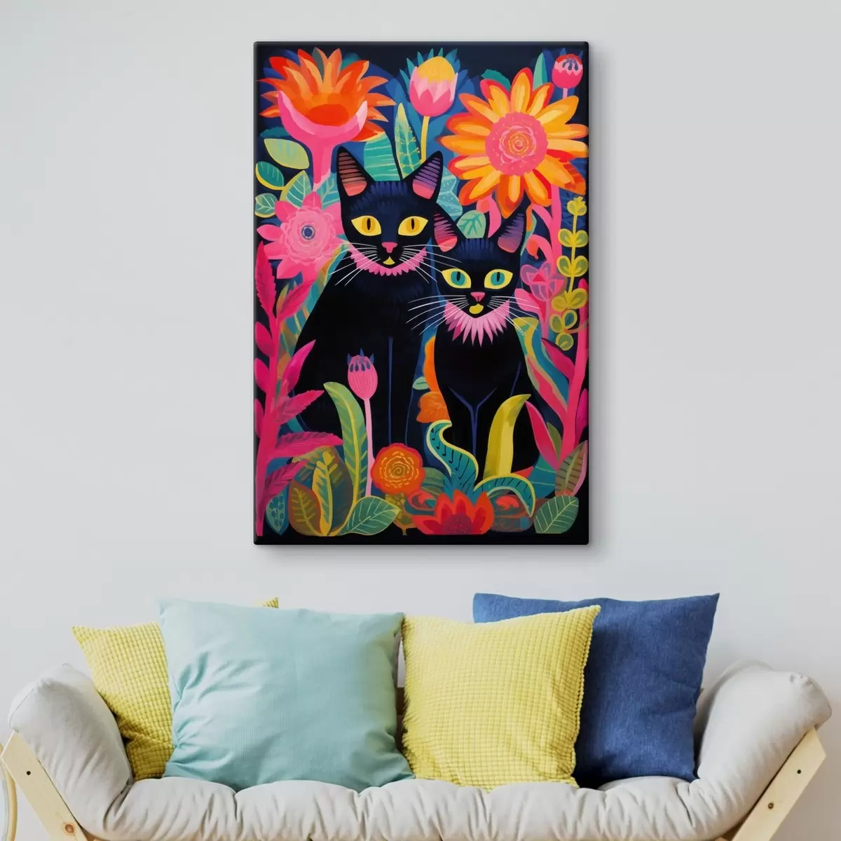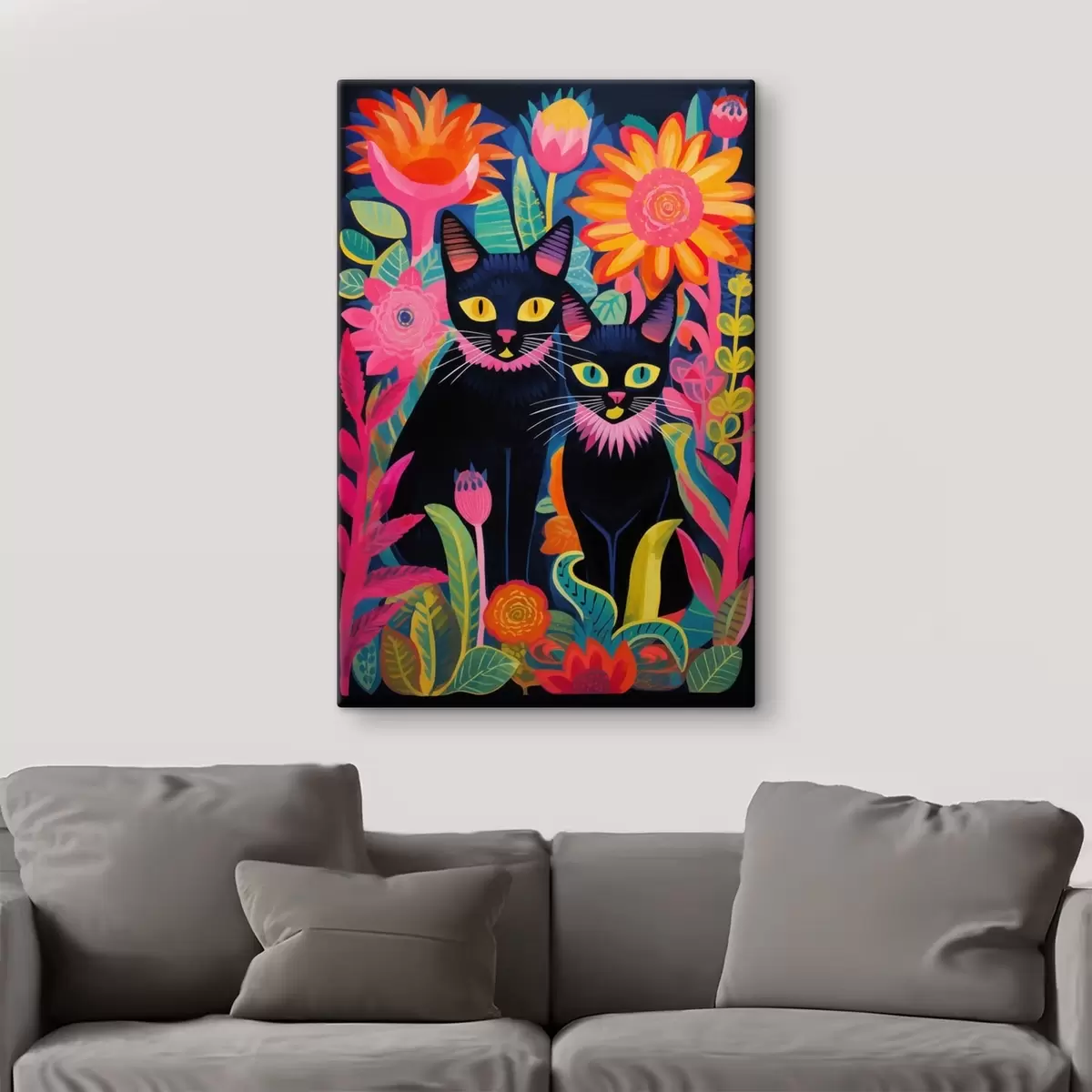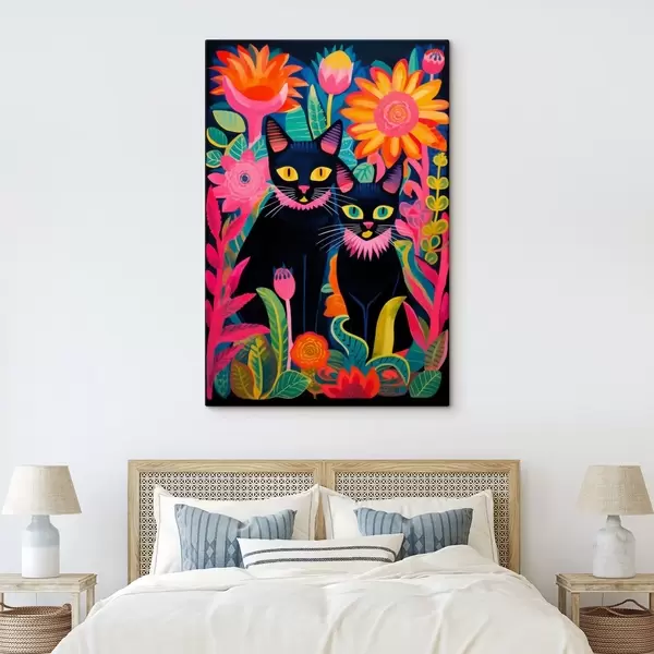 Vászonkép Két fekete macska a ragyogó virágok között Nr s47299