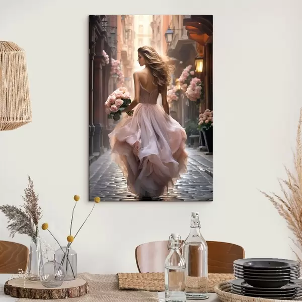 Vászonkép Rózsaszín ruhás nő sétál az utcán Nr s47316