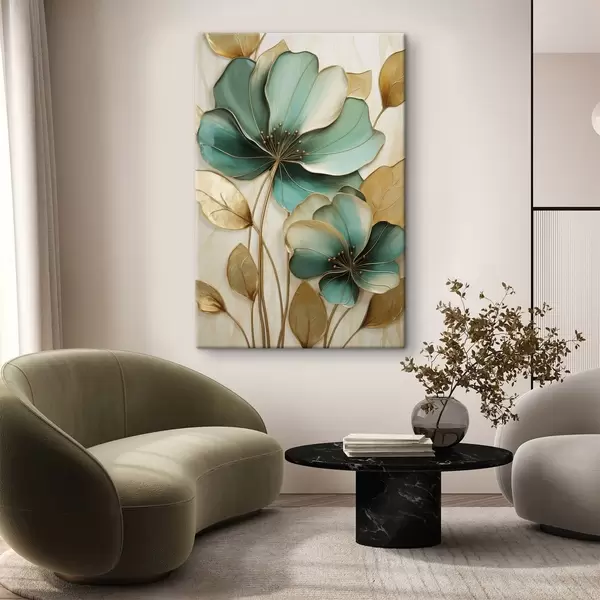 Vászonkép Nagy, kontúrokkal ellátott, kékes-zöld és sárga virágok, sárga levelekkel körülvéve, absztrakt háttér előtt Nr s47418