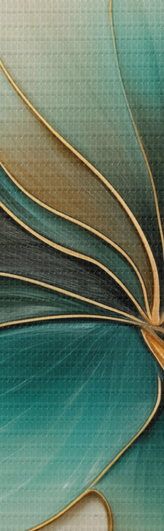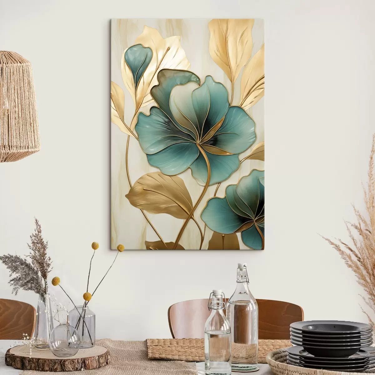 Vászonkép Nagy, kontúrokkal ellátott, kékes-zöld és sárga virágok, sárga levelekkel körülvéve, absztrakt háttér előtt Nr s47419
