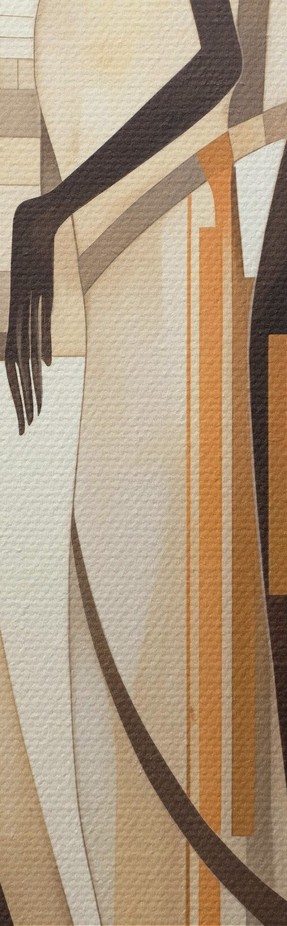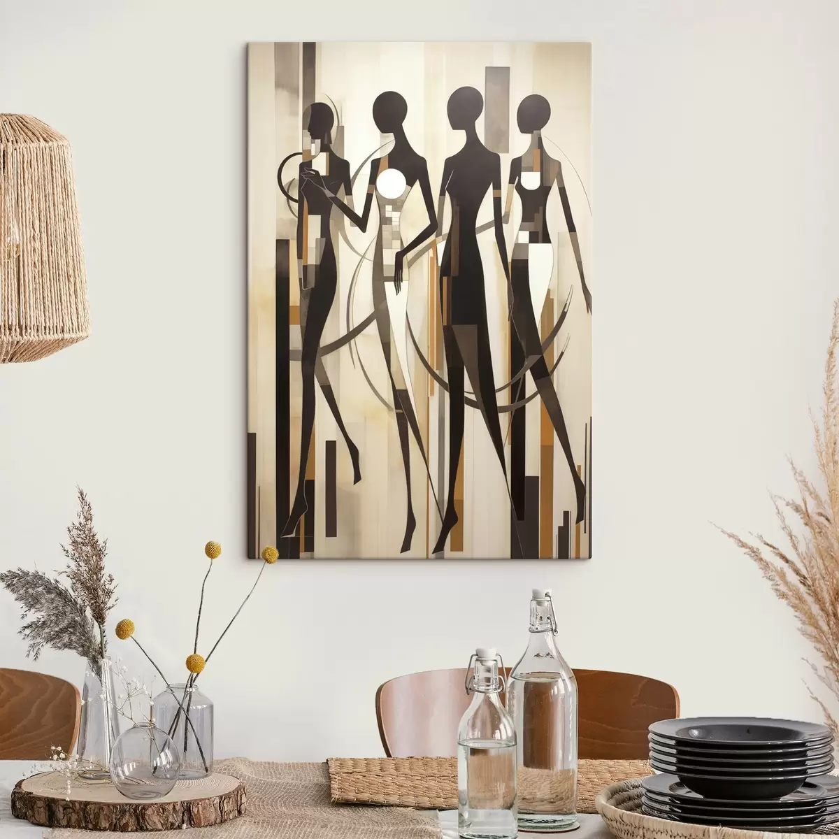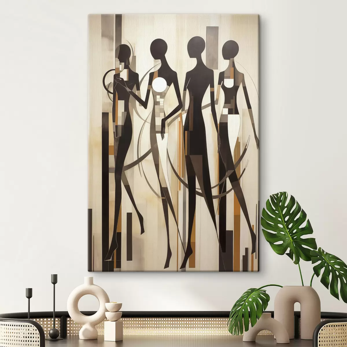 Vászonkép Stilizált női alakok geometrikus elemekkel, függőleges vonalakból álló absztrakt háttér előtt Nr s47423