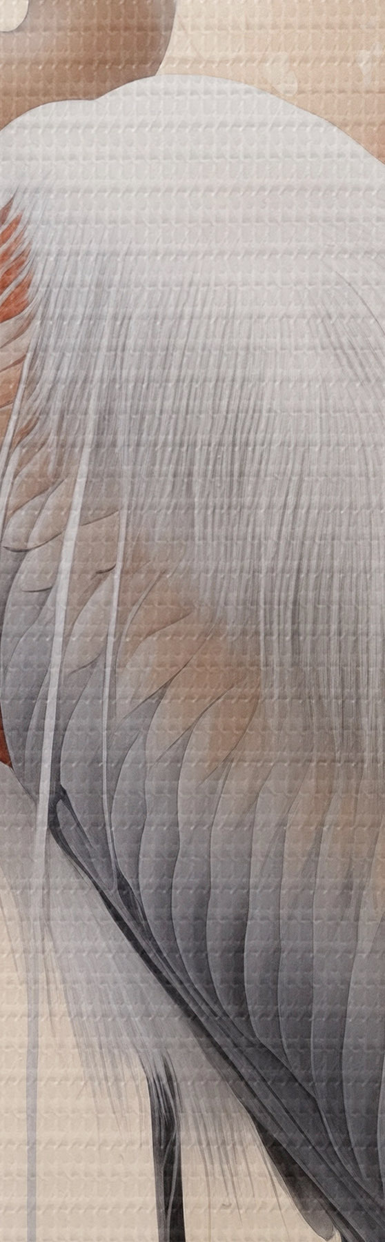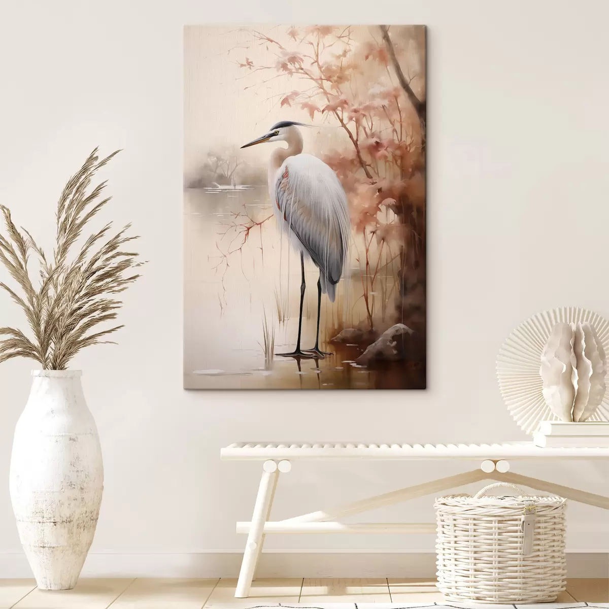 Vászonkép Egy gém áll egy sziklán egy tóban, magas fű és fákkal a háttérben. Nr s47427