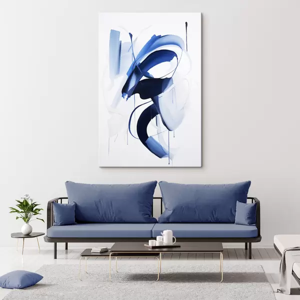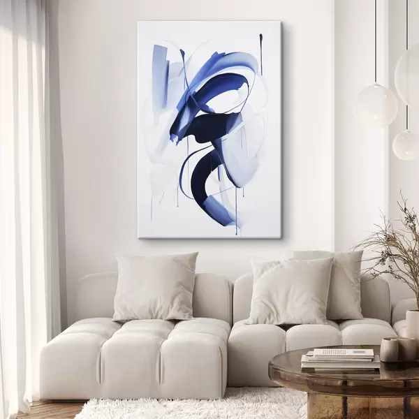 Vászonkép Absztrakt kék ecsetvonás-szerű formák folyékony vonalakkal és görbékkel fehér háttér előtt, modern művészet Nr s47428