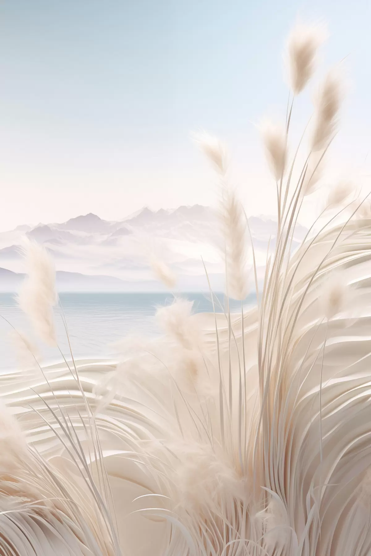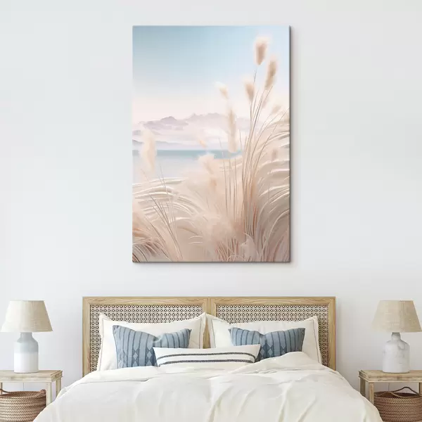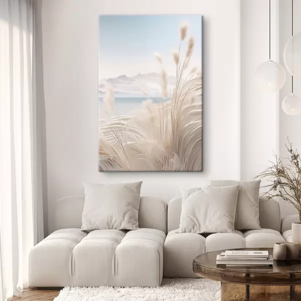 Vászonkép Magas, tollas pampas fű puha bézs árnyalatokban, homokos stranddal és hegyekkel a háttérben Nr s47433