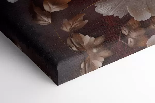 Vászonkép Finom pünkösdi rózsák vékony, szálas szirmokkal, sötétvörös és sárga levelekkel körülvéve, absztrakt háttér előtt Nr s47435