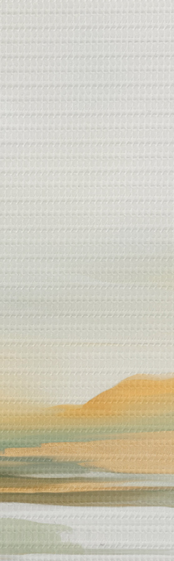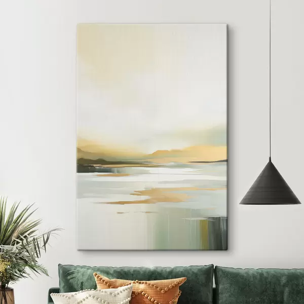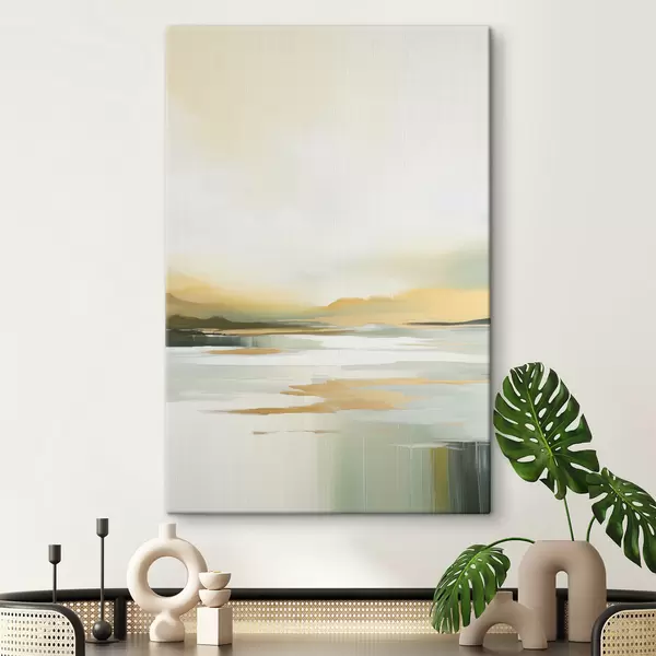 Vászonkép Absztrakt táj sárga és zöld árnyalatokkal, az eget és a távoli hegyeket tükröző víz, halvány, ködös égbolt Nr s47439