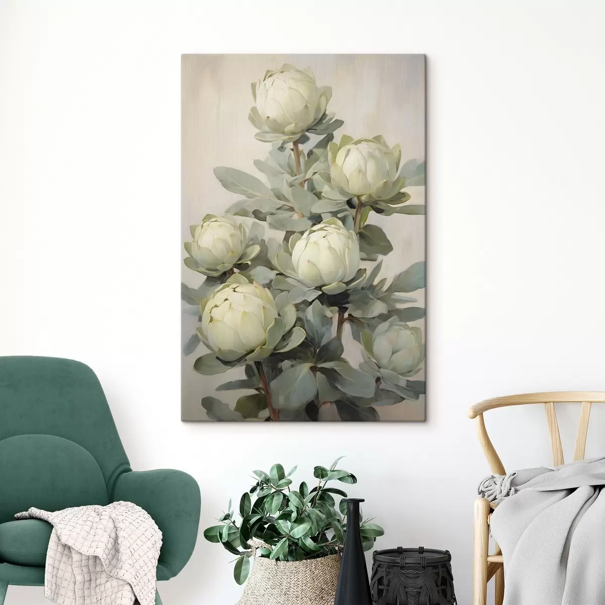 Vászonkép Több fehér protea virág és nagy zöld levelek festészeti stílusa világos háttér előtt Nr s47861