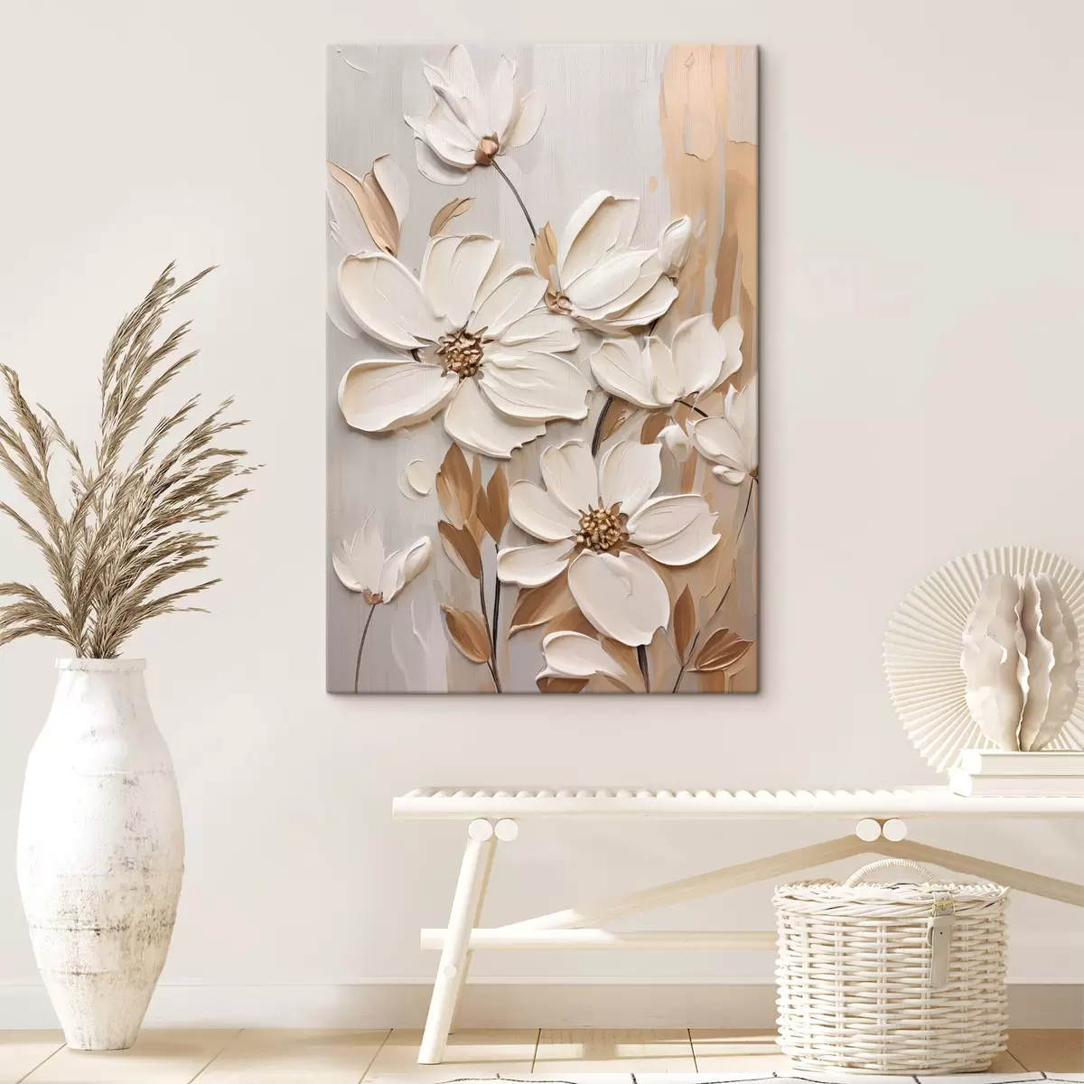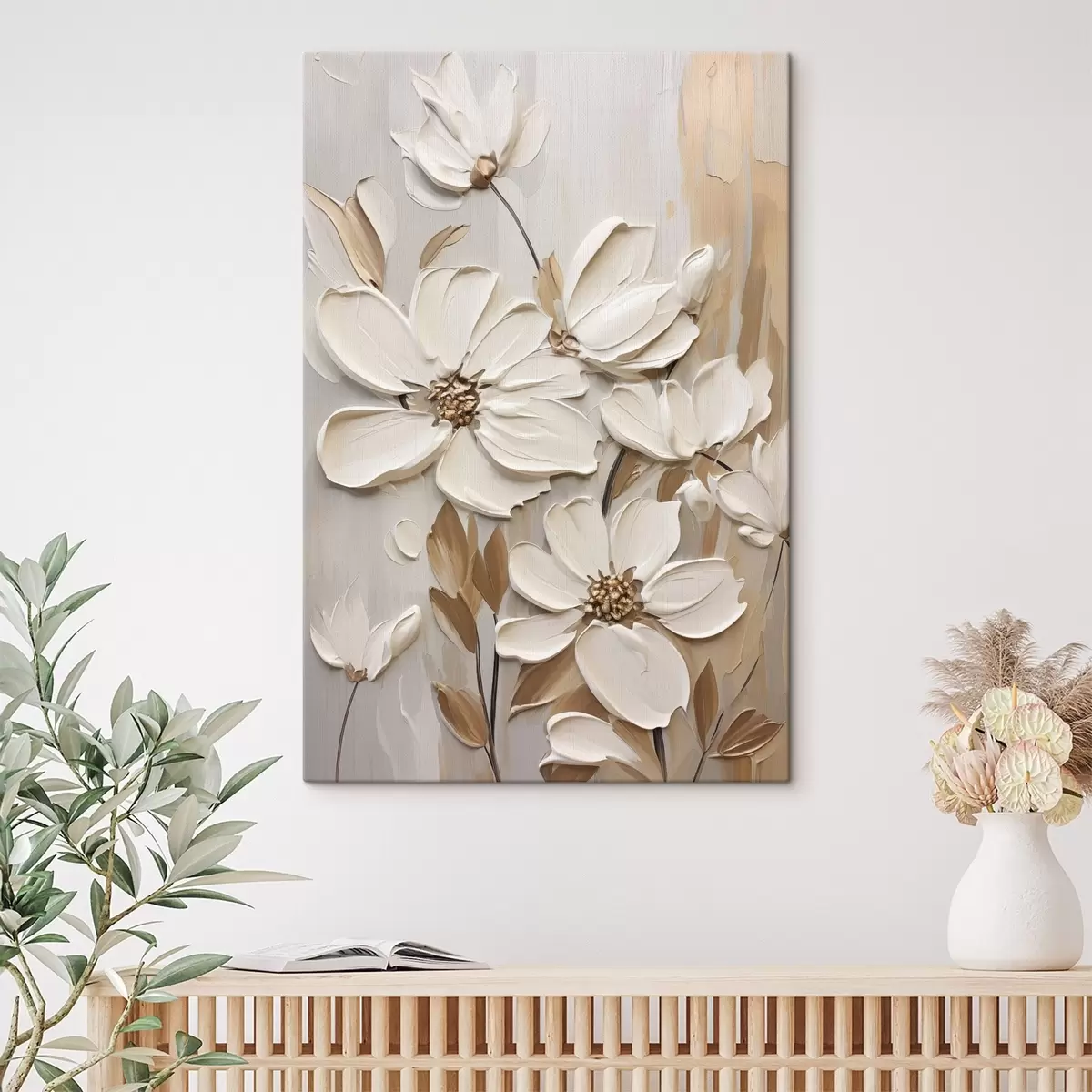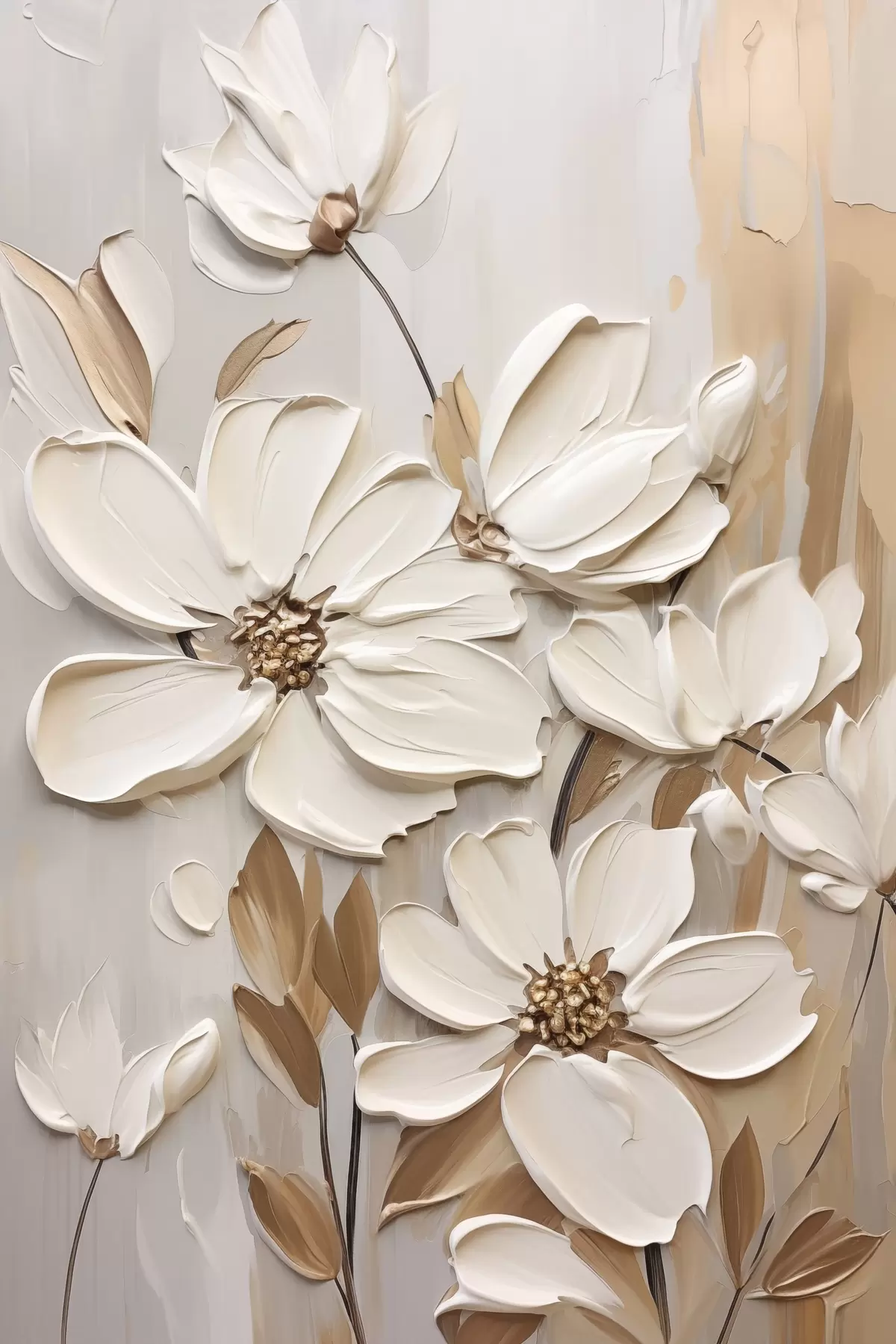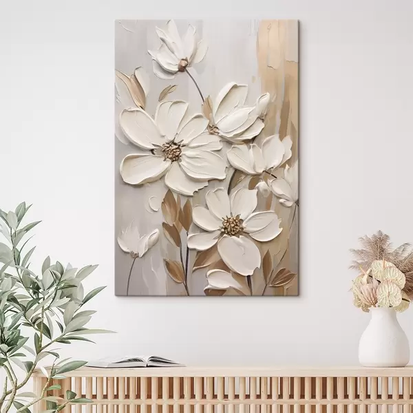 Vászonkép Absztrakt fehér virágok texturált szirmokkal, semleges háttér előtt, finom ecsetvonásokkal imitálva. Nr s47873