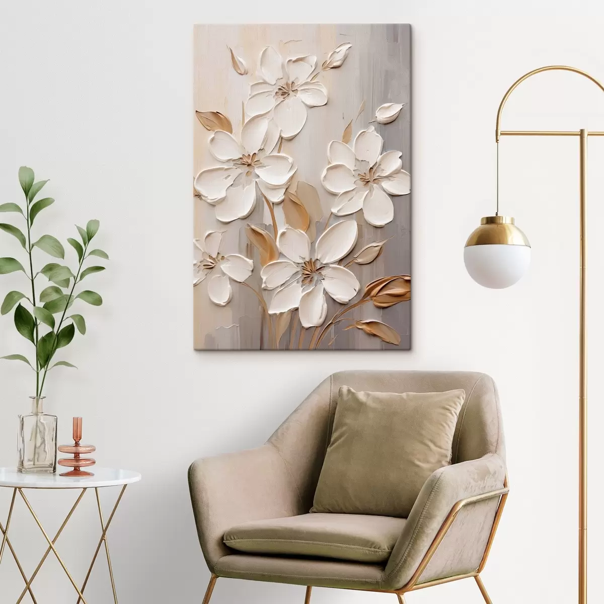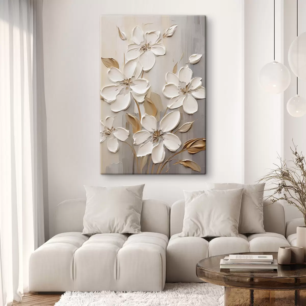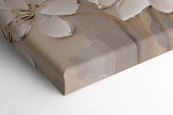 Vászonkép Absztrakt fehér virágok texturált szirmokkal, semleges háttér előtt, finom ecsetvonásokkal imitálva. Nr s47874