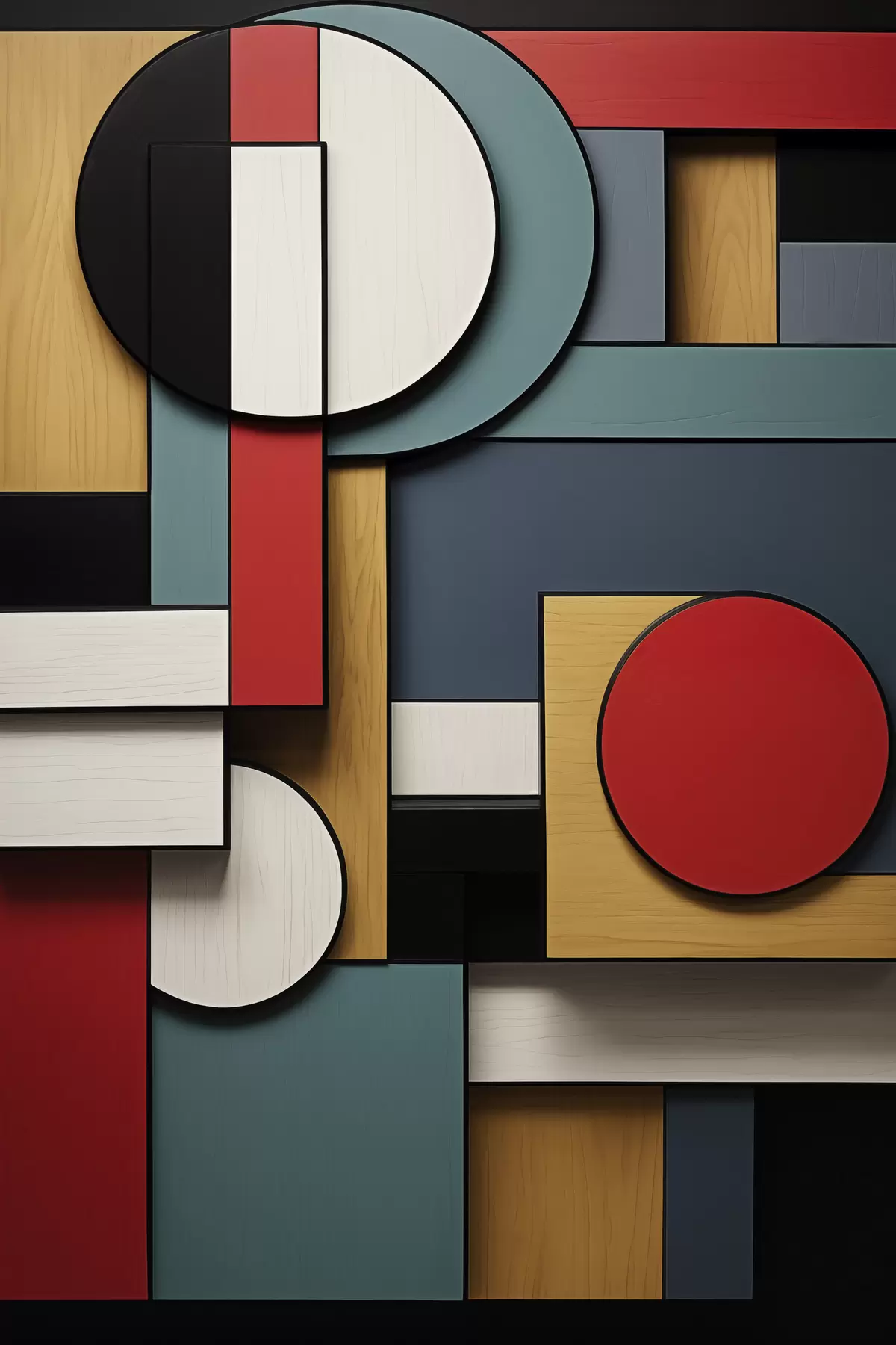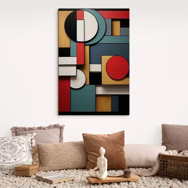 Vászonkép Absztrakt geometrikus kompozíció fa textúra utánzattal, piros, fekete, fehér és türkizkék téglalapokkal és körökkel Nr s47875