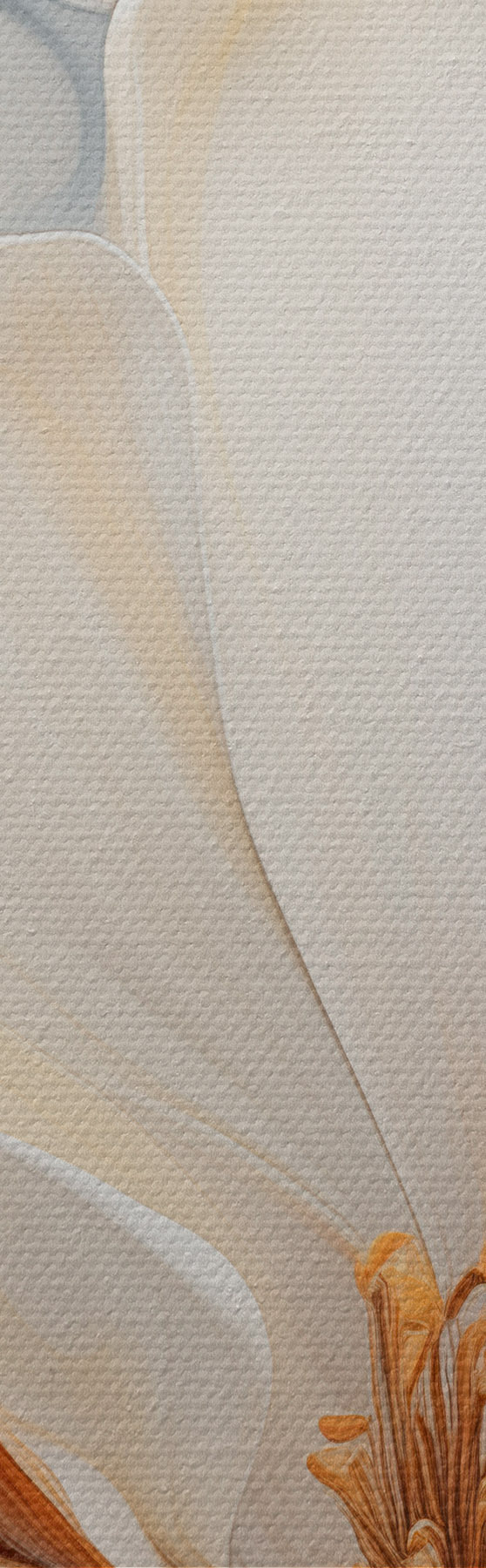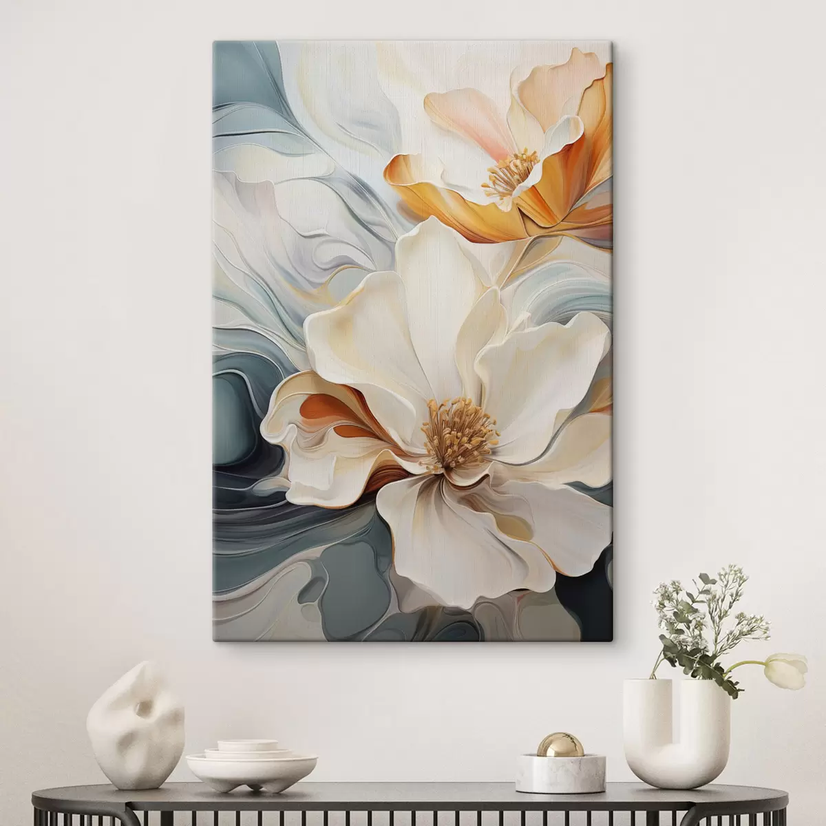 Vászonkép Absztrakt nagy virág fehér, narancssárga és türkizkék szirmokkal, texturált háttérrel Nr s47878