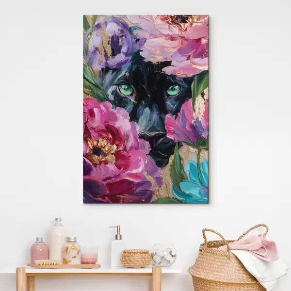 Vászonkép egy fekete párduc kandikál ki a pünkösdi rózsák közül Nr s47936