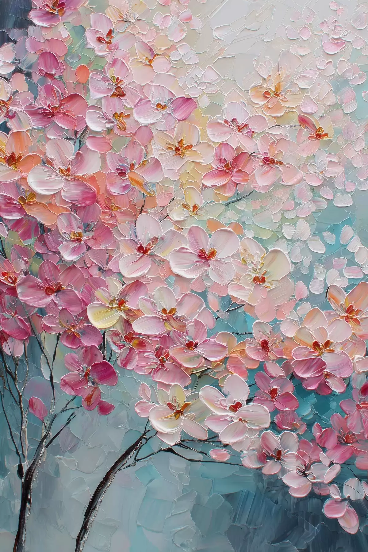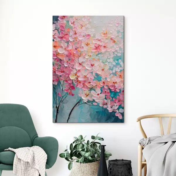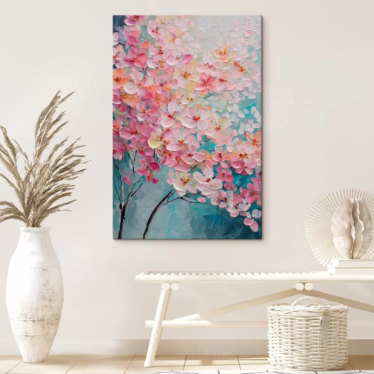 Vászonkép Rózsaszín virágokkal díszített ág kék háttér előtt, olajfestmény stílusban Nr s47987
