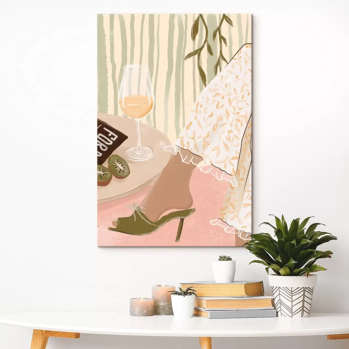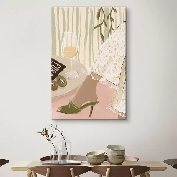Vászonkép Asztal borospohárral és kivi gyümölccsel, ruha mellett Nr s48021