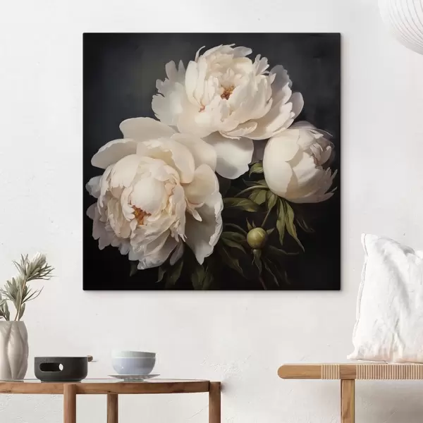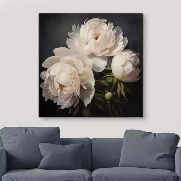 Vászonkép Fehér pünkösdi rózsák sötét háttér előtt Nr s48101