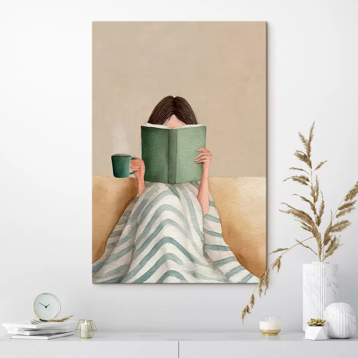 Vászonkép lágy akvarell illusztráció egy kanapén ülő, könyvet olvasó nőről Nr s48114