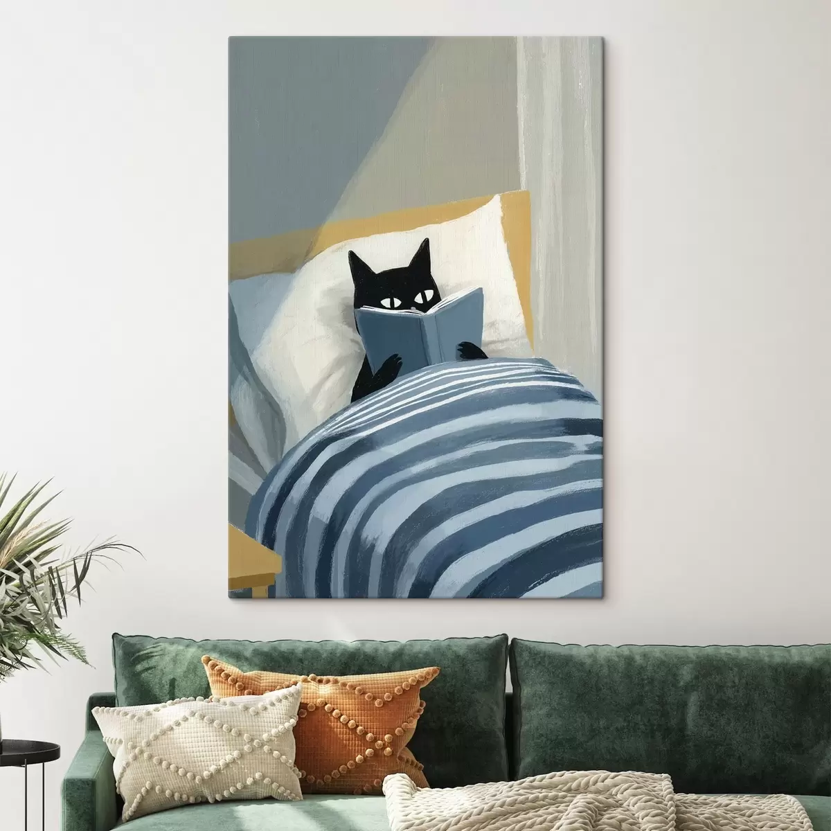 Vászonkép minimalista, lapos illusztráció egy fekete macskáról, aki ágyban könyvet olvas Nr s48117