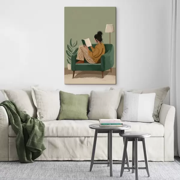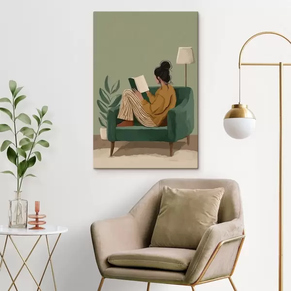 Vászonkép minimalista, hangulatos illusztráció egy karosszékben ülő, olvasó nőről Nr s48118