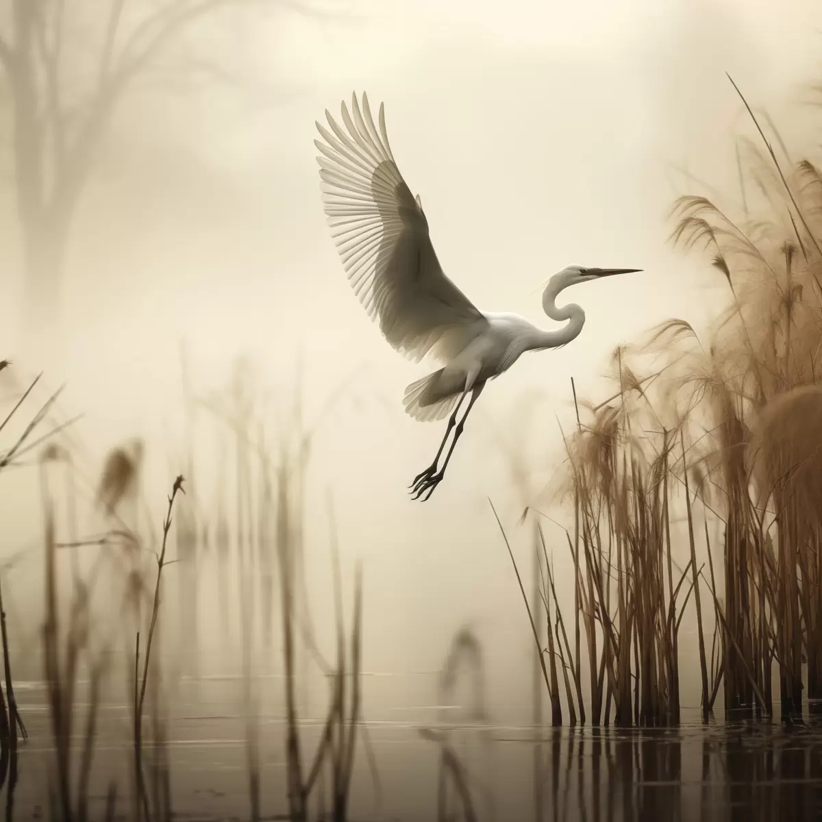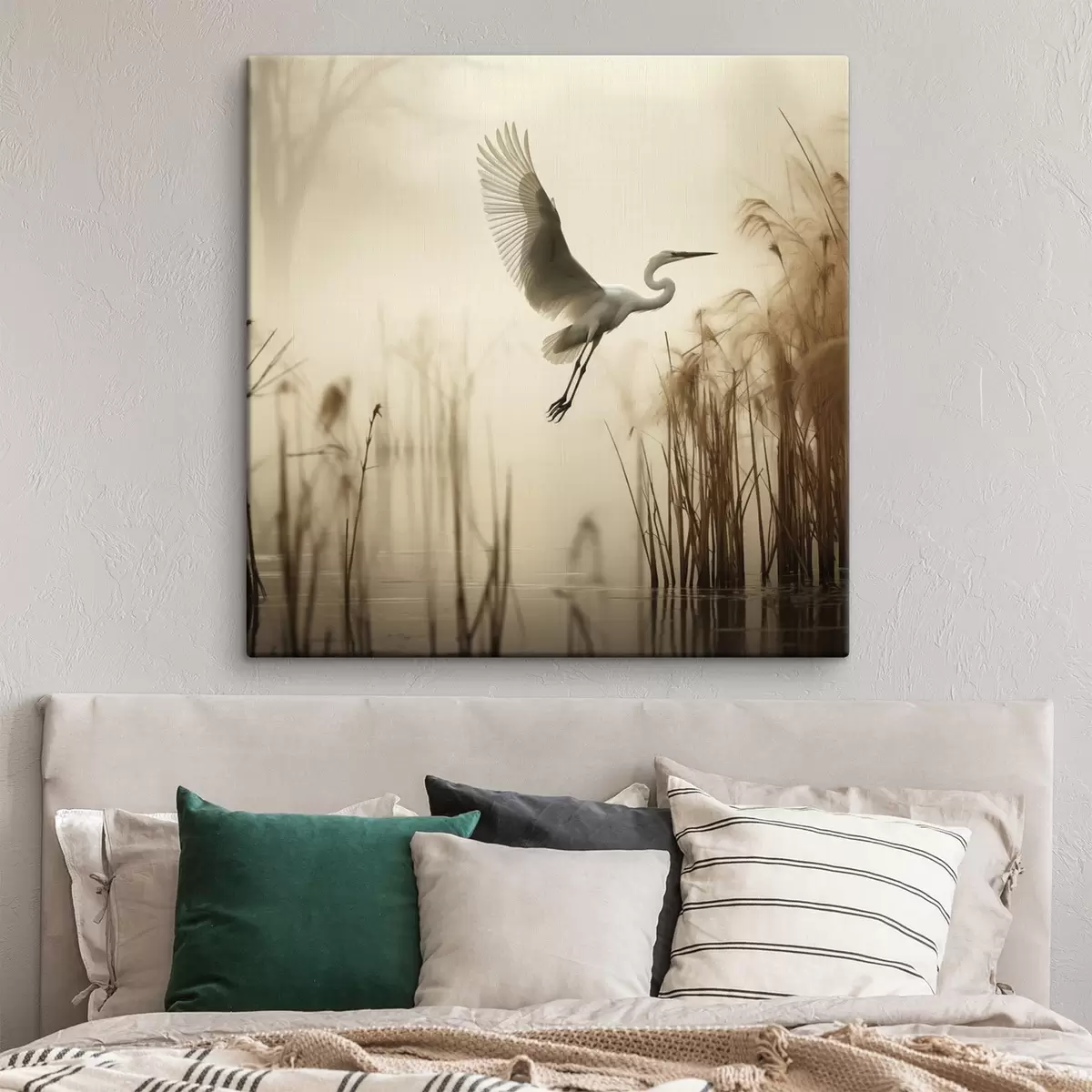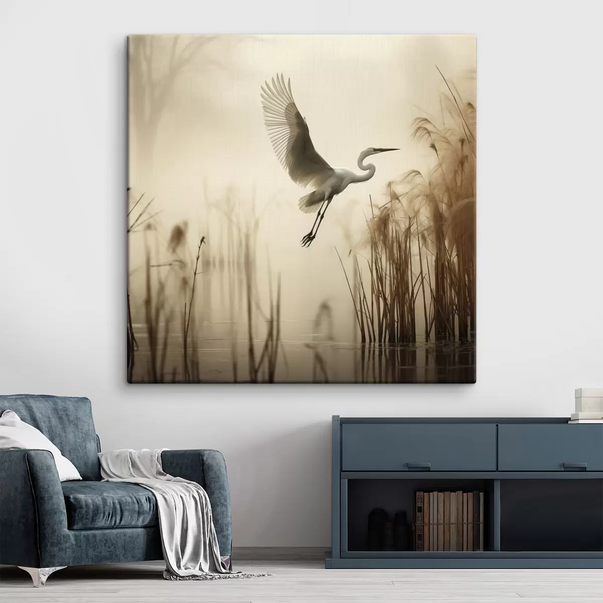 Vászonkép Egy fehér gém repül át egy tó felett, amelyet magas nádas és a háttérben álló fák vesznek körül Nr s48389