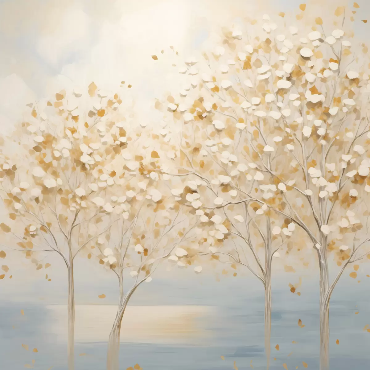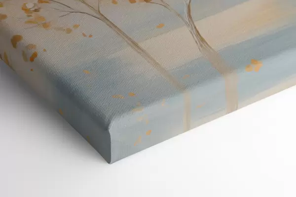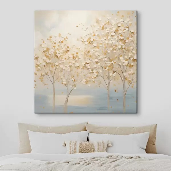 Vászonkép Texturált festmény, amelyen fehér és sárga levelű fák láthatók világoskék háttér előtt Nr s48392