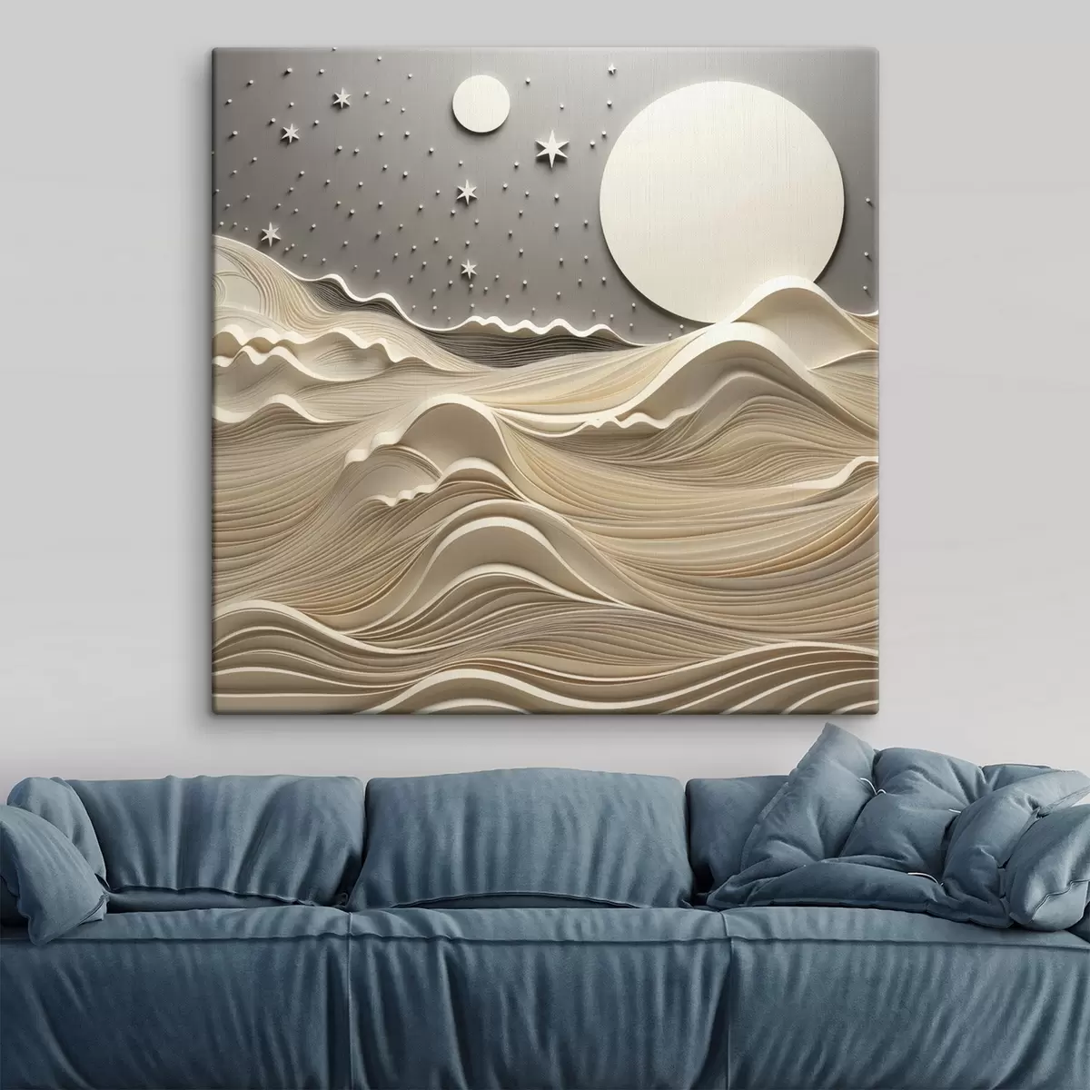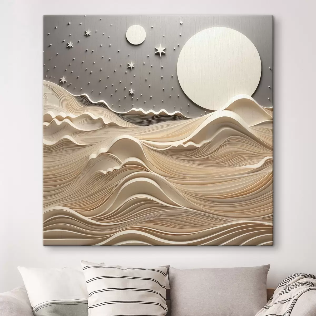 Vászonkép Minimalista, stilizált tájkép dombos hegyekkel és egy nagy holddal a csillagos égbolton, absztrakt művészet Nr s48401