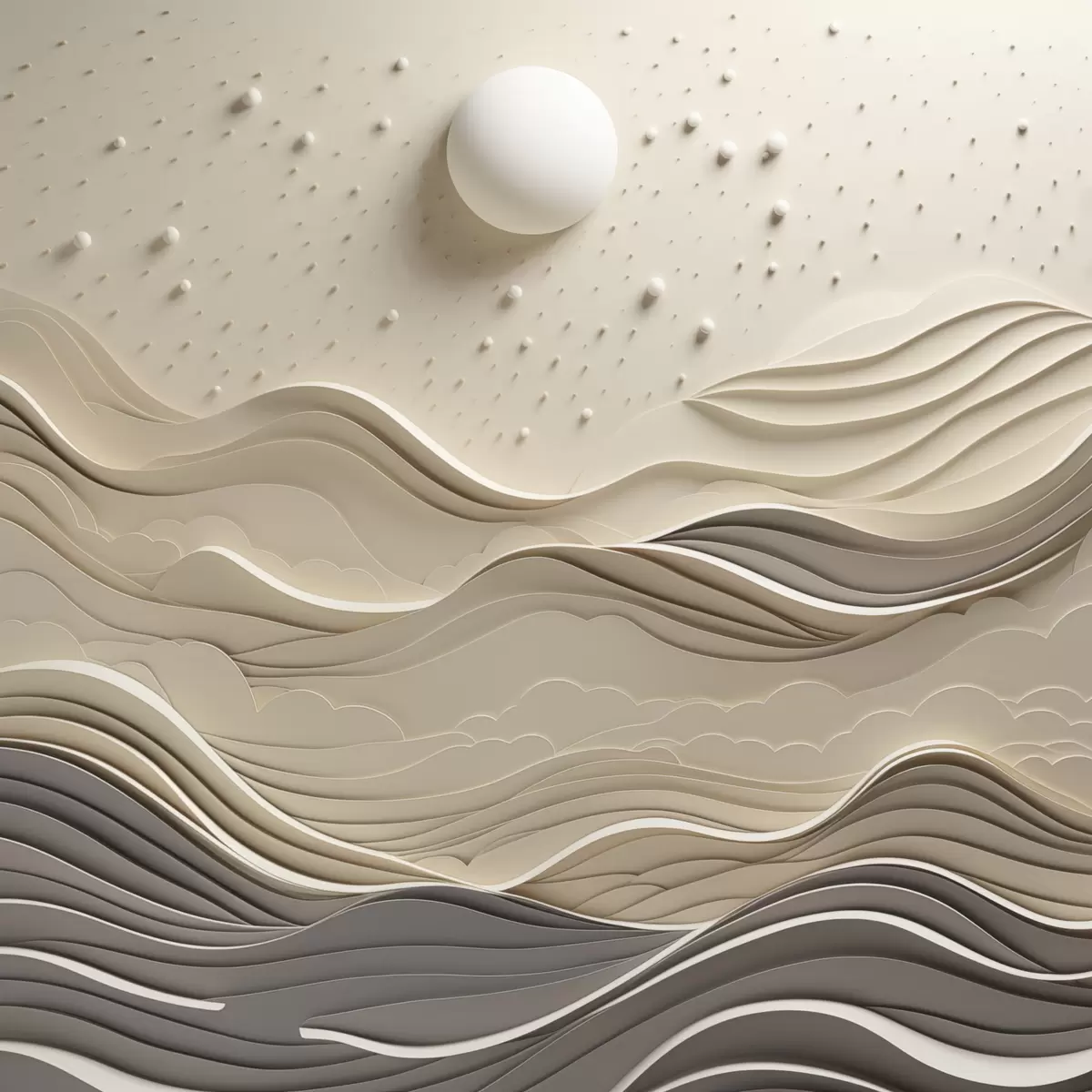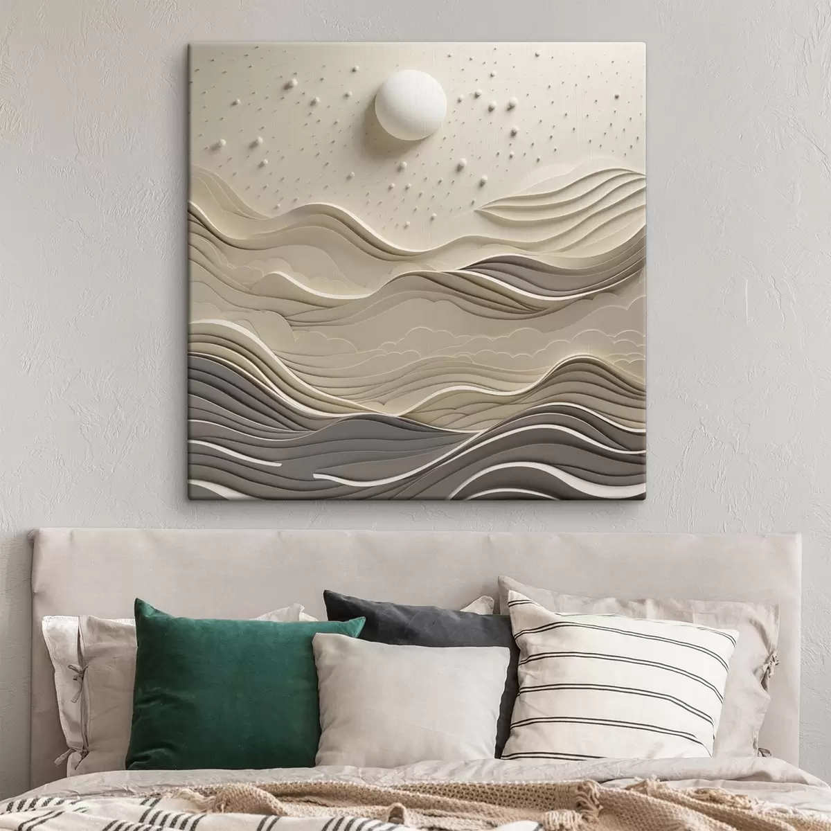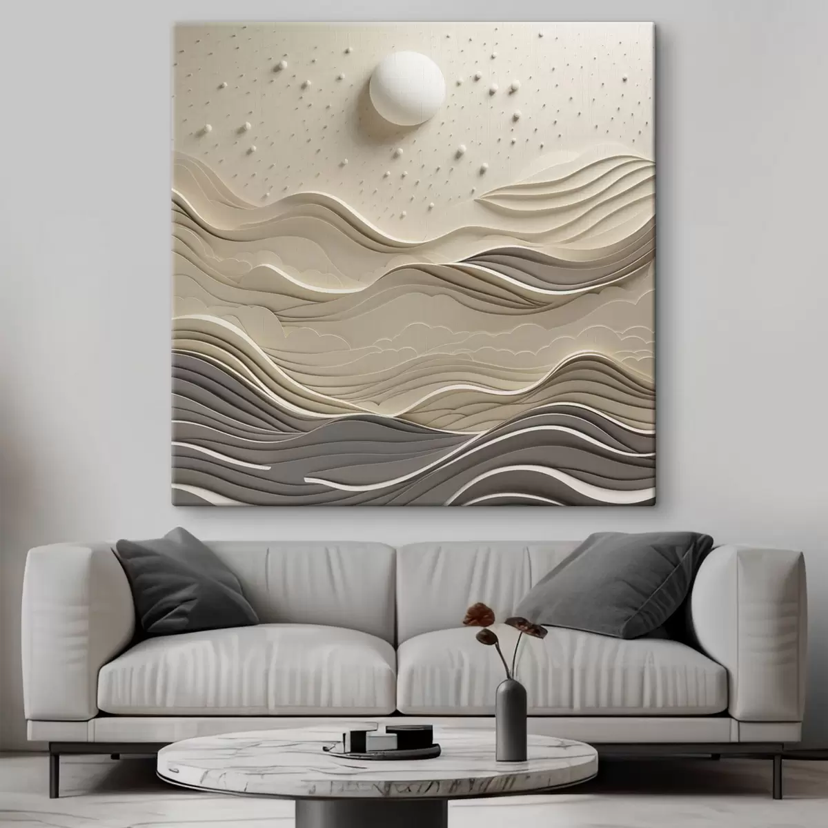 Vászonkép Minimalista, stilizált tájkép dombos hegyekkel és egy nagy holddal a csillagos égbolton, absztrakt művészet Nr s48402