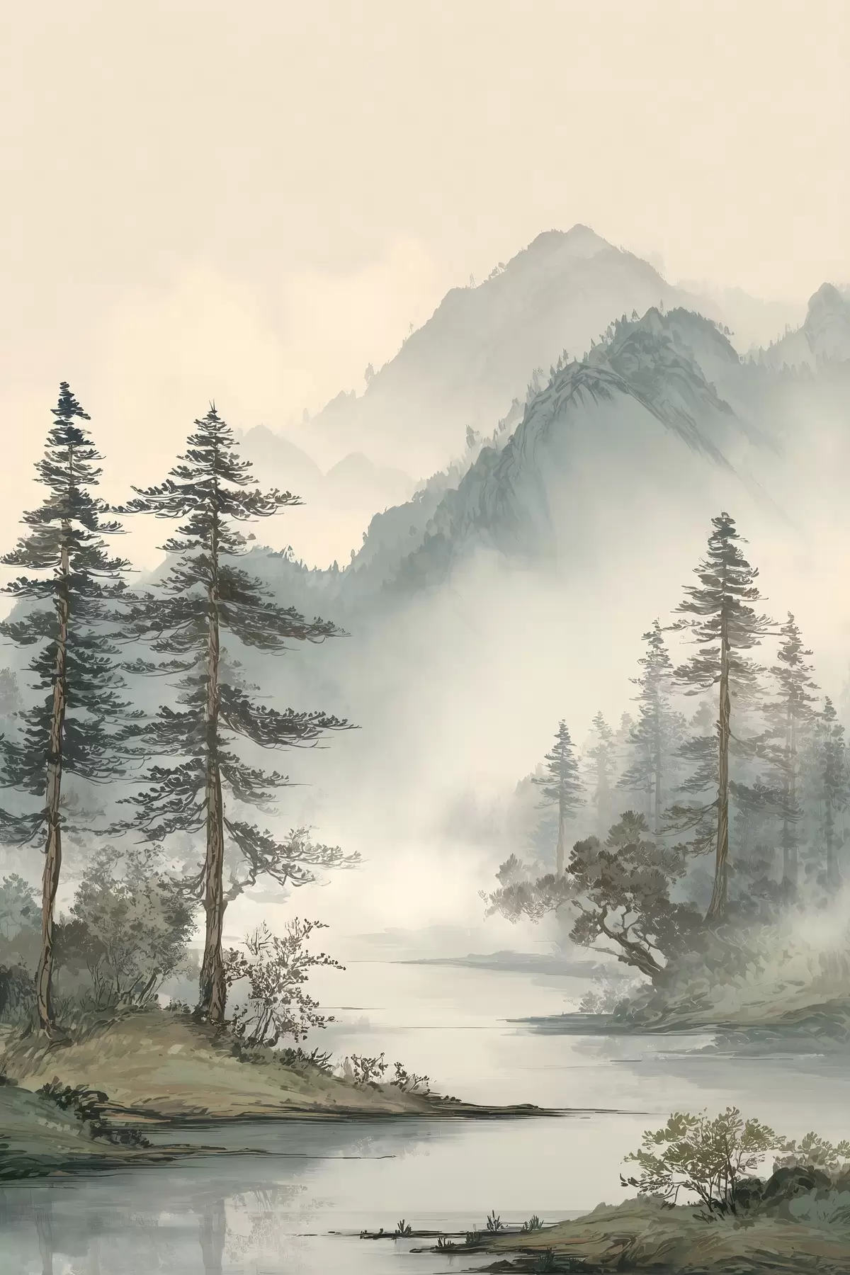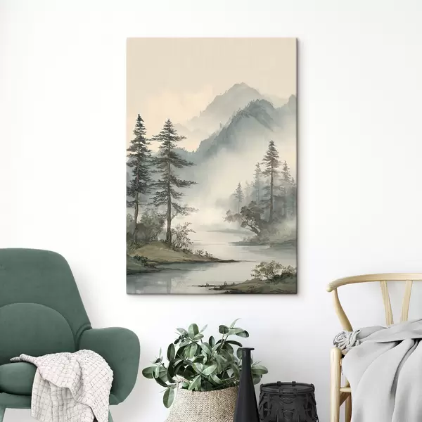 Vászonkép hegyvidéki táj fenyőfákkal és egy folyóval Nr s48532