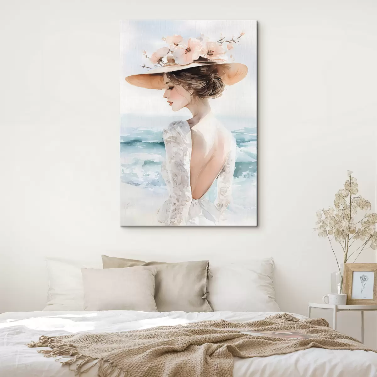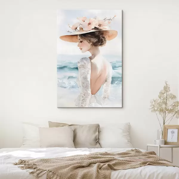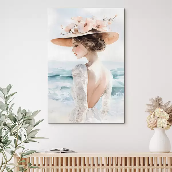 Vászonkép egy romantikus lány a tengerparton, kalapban Nr s48547