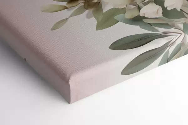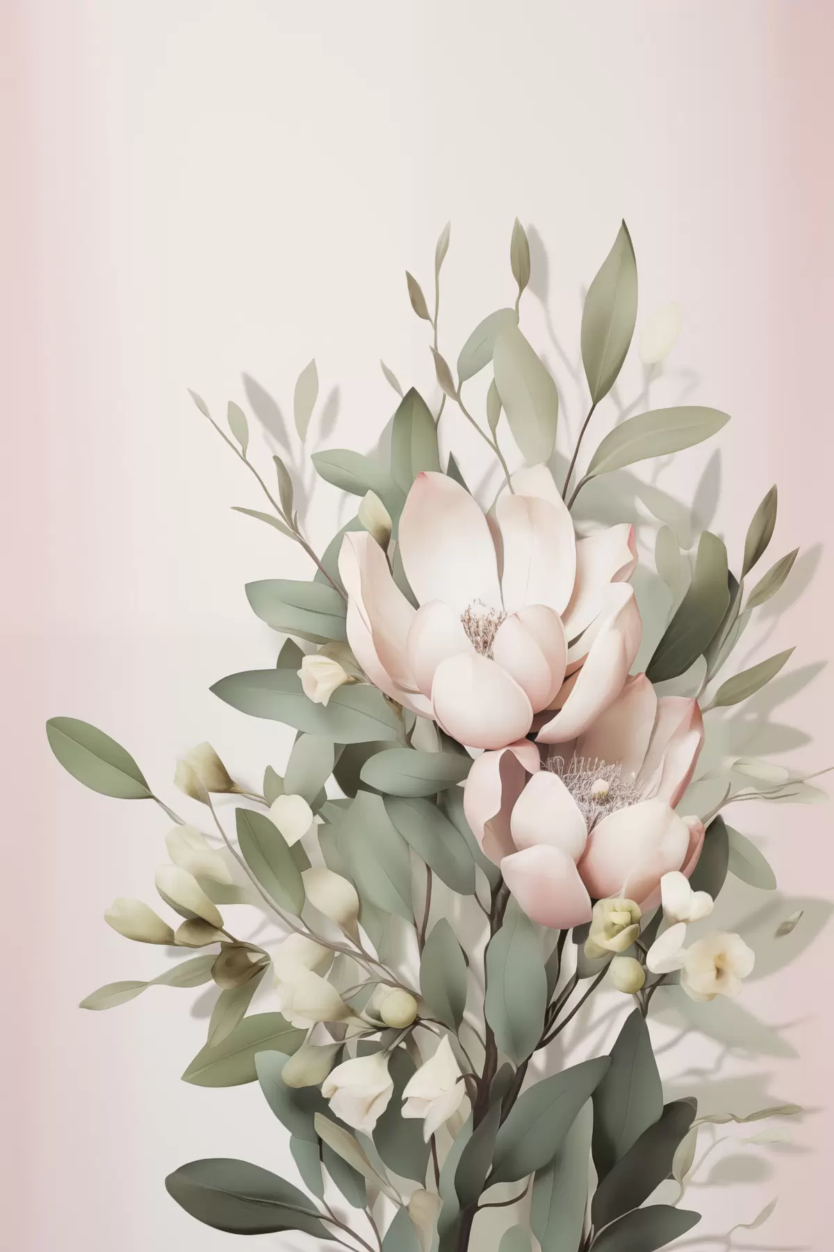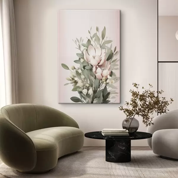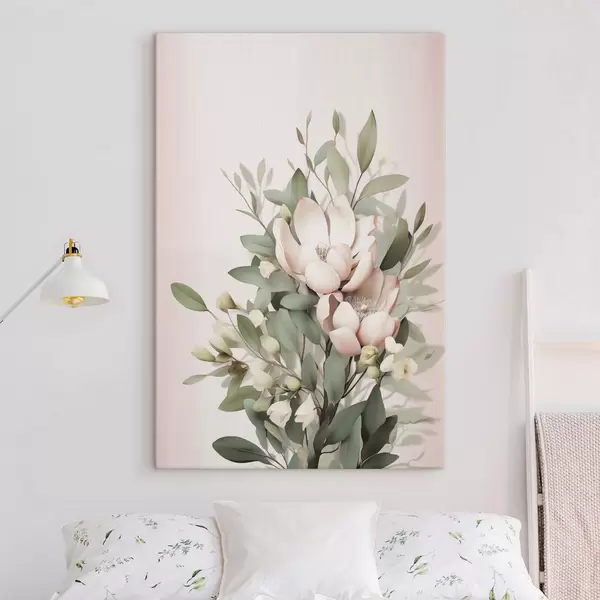 Vászonkép Pasztellszínű virágokból álló csokor eukaliptuszlevelekkel, halványrózsaszín háttérrel Nr s48728