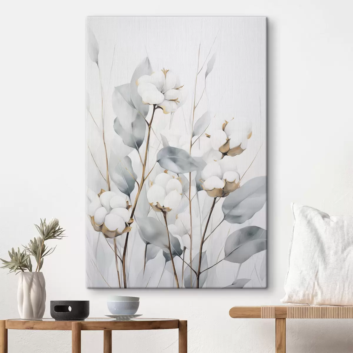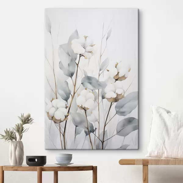 Vászonkép Fehér pamutnövény halvány kék-zöld levelekkel világos háttér előtt Nr s48743