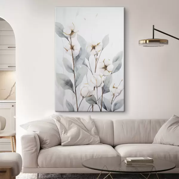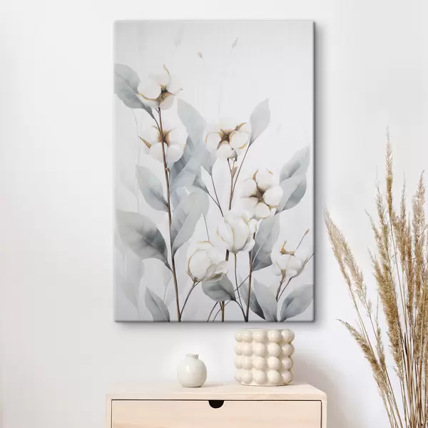 Vászonkép Fehér pamutnövény halvány kék-zöld levelekkel világos háttér előtt Nr s48744