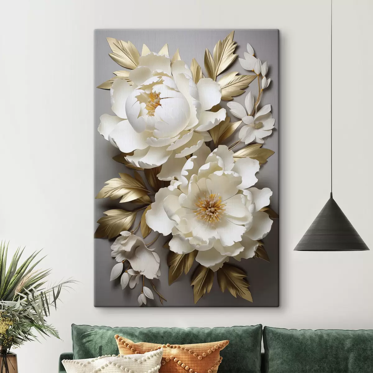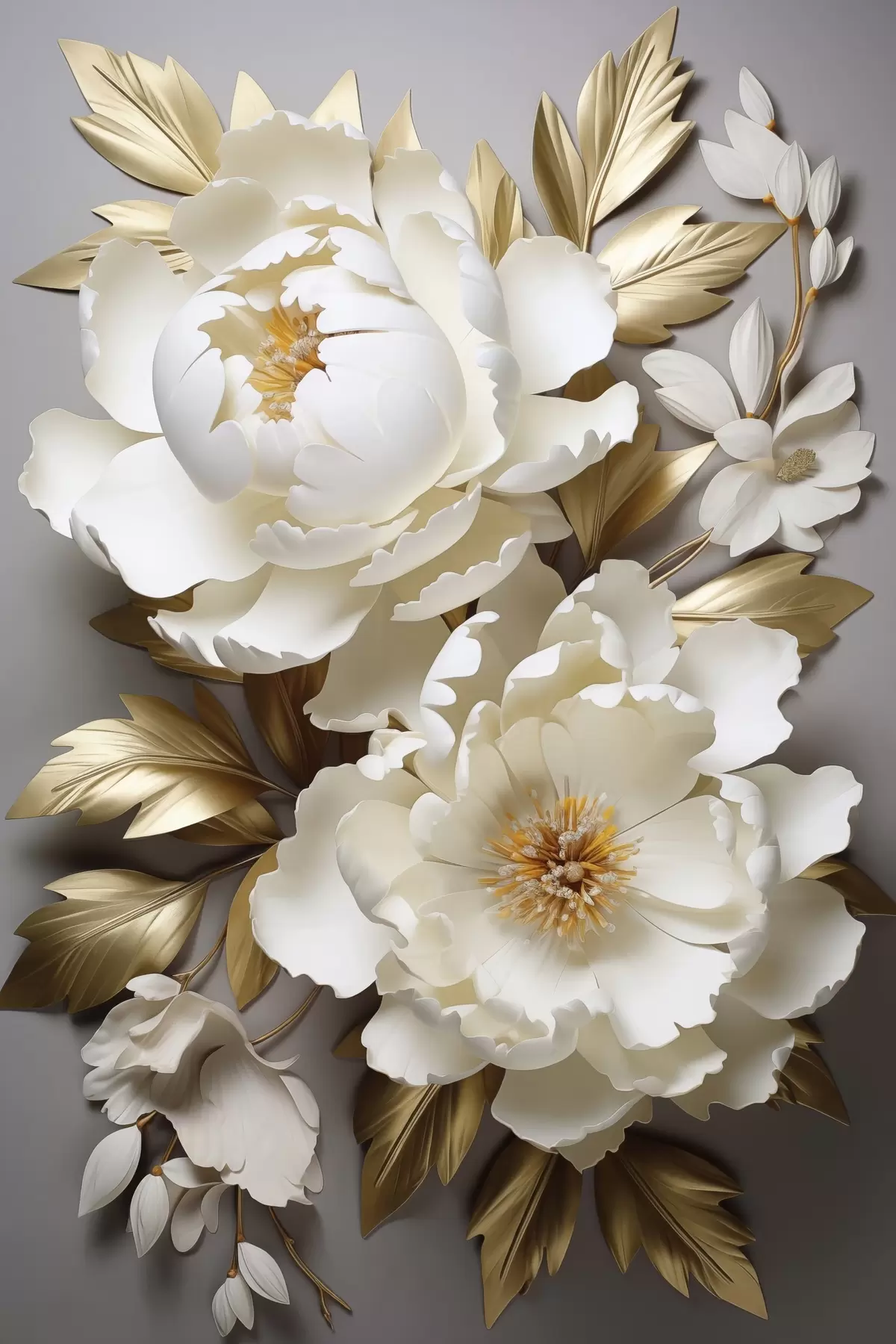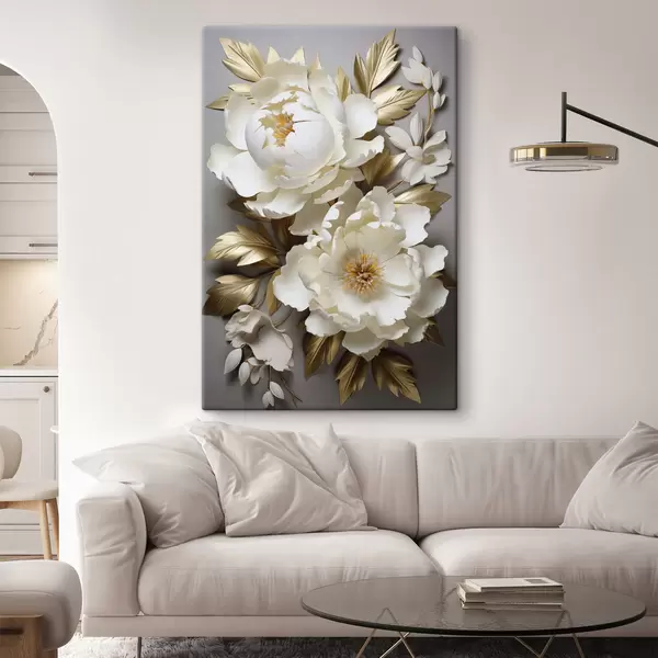 Vászonkép Nagy fehér pünkösdi rózsák sárga levelekkel szürke háttér előtt Nr s48753