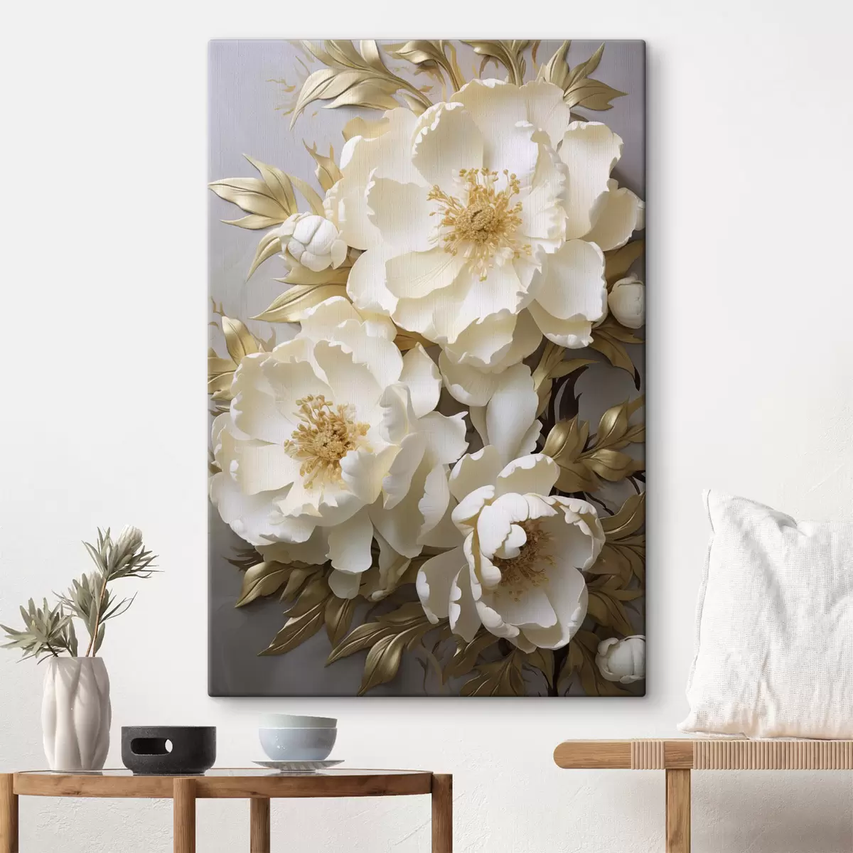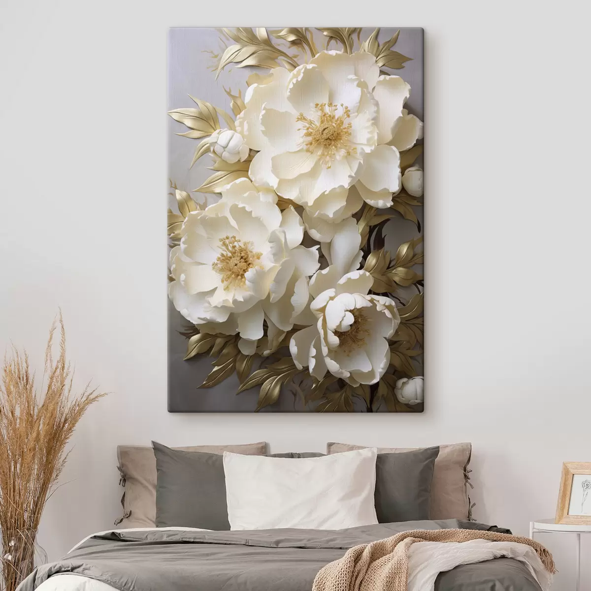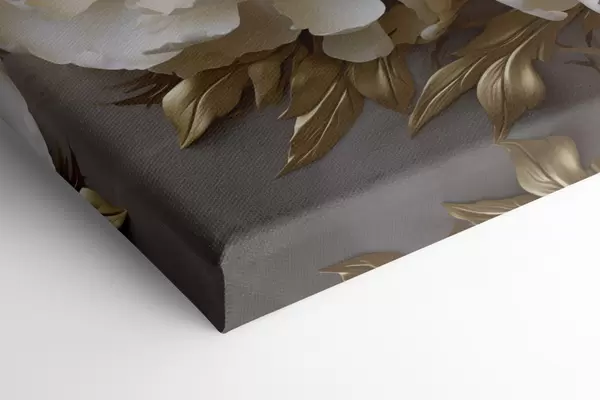Vászonkép Nagy fehér pünkösdi rózsák sárga levelekkel szürke háttér előtt Nr s48754