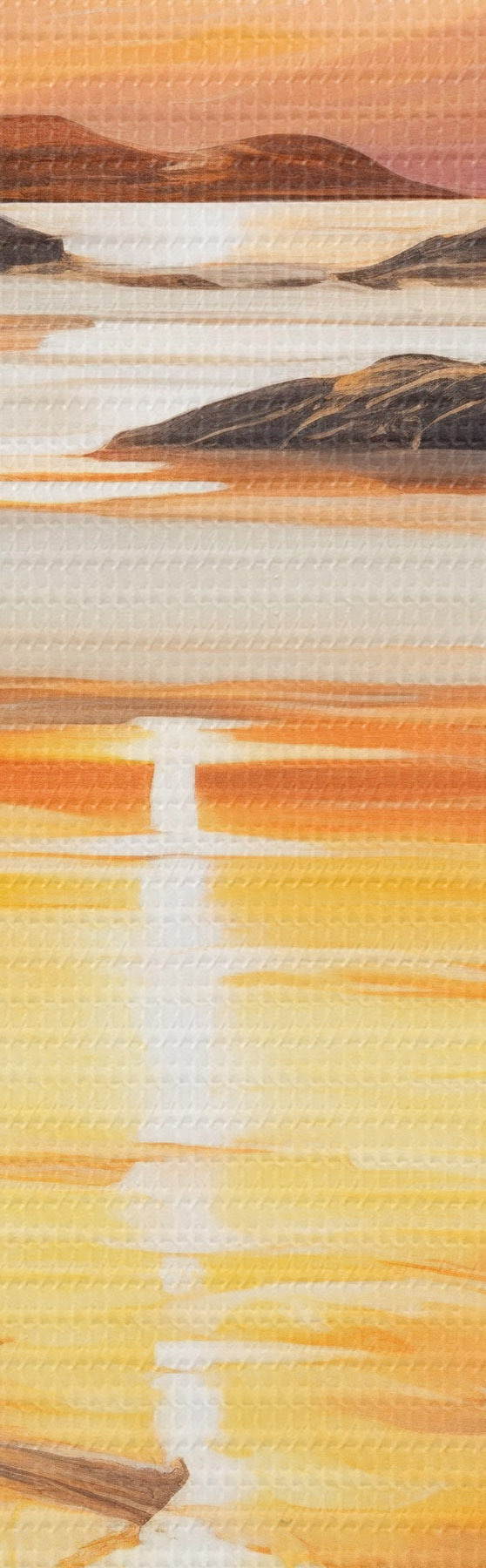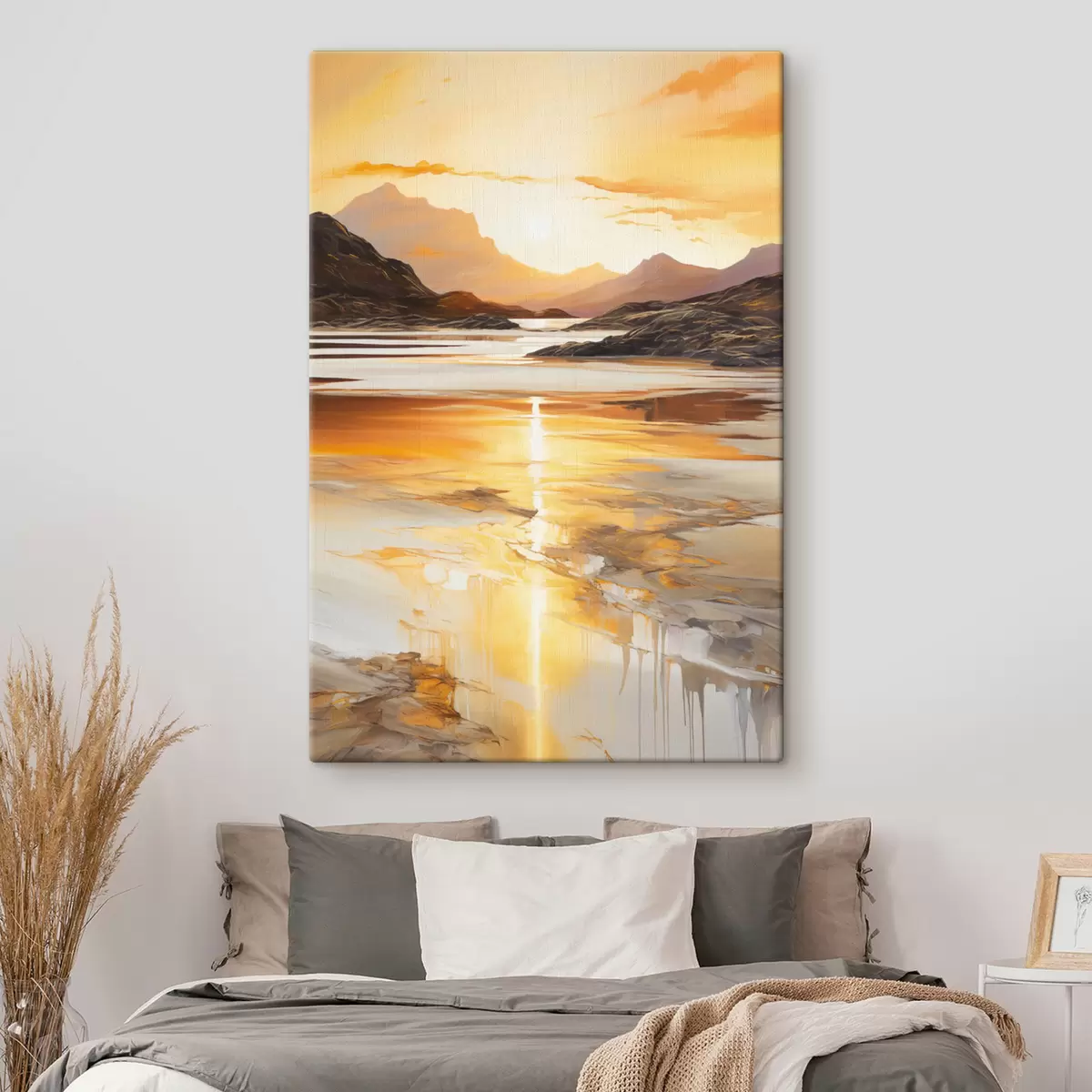 Vászonkép Tájkép folyóval és hegyekkel, meleg narancssárga égbolton, naplemente Nr s48755